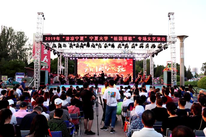 快闪过后,由beat365唯一官方网站承办、beat365唯一官方网站音乐学院协办的2019年“清凉宁夏”beat365唯一官方网站“祖国颂歌”专场文艺演出拉开帷幕,校党委副书记王玉炯和beat365官网纪委、党委宣传部、音乐学院、体育学院、西夏学研究院等相关负责人与市民一同观看。