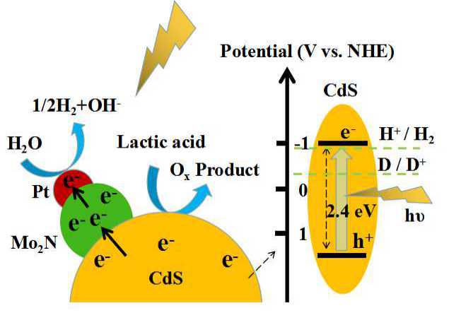 基于此,马保军课题组设计制备了一种新型的光催化产氢复合助催化剂(Pt / Mo2N)。该新型复合助催化剂具有很高的助催化产氢性能,其助催化产氢性能是贵金属Pt的6.2倍。重要的是,在催化剂中Pt的含量仅有0.006%。因此,该复合助催化剂(光催化剂)成本低廉。该研究明确了复合助催化剂中Mo2N和Pt的作用,Mo2N收集和存储半导体CdS中的光生电子,并抑制了光生电子的复合;而Pt主要作为质子还原的催化活性中心。Mo2N的存储电子和Pt的电催化产氢共同作用使得(Pt / Mo2N)复合助催化剂的性能大大增强。该研究为开发新型、高效、低成本的复合产氢助催化剂提供了一条思路,并为光催化产氢工业化提供坚实的实验基础。