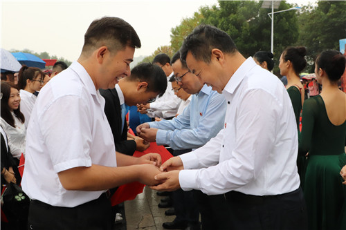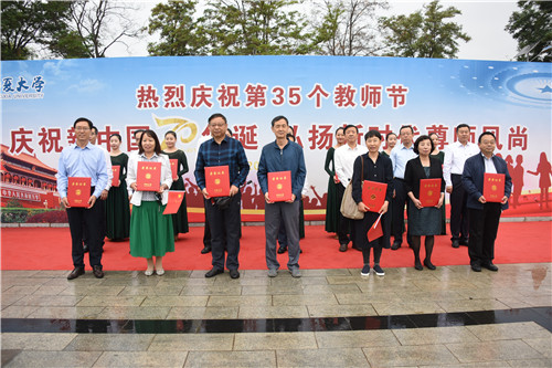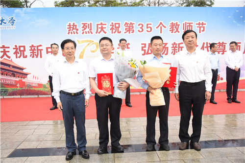 党委书记李星、校长何建国为获2019年“全国优秀教师”的经济管理学院教师黄旭兴、2019年“全国优秀教育工作者”的机械工程学院教师张波颁发获奖证书。