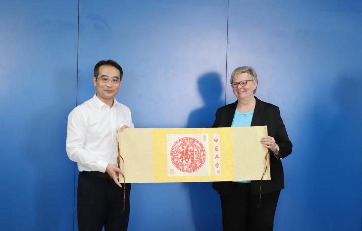 史金龙与妮卡·吉塞拉·克里斯特曼代表两校互赠纪念品。