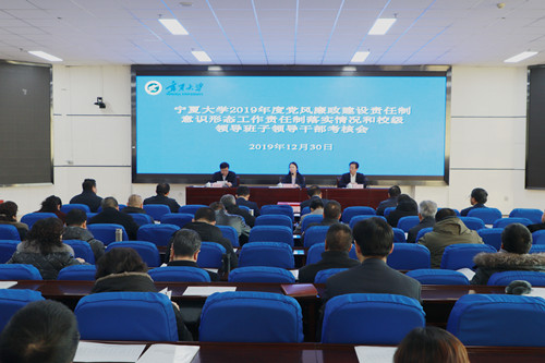 【beat365唯一官方网站新闻中心讯 苏雯/文、李明花/图】12月30日,beat365官网召开2019年度党风廉政建设责任制、意识形态工作责任制落实情况和校级领导班子领导干部考核会。自治区第六检查考核组成员出席考核会。校党委副书记、校长何建国主持会议。