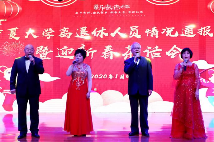 “歌唱我们亲爱的祖国,从今走向繁荣富强....”大合唱《歌唱祖国》拉开了新年会的序幕。弦乐《采茶曲》、四重唱《珊瑚颂》、广场舞《吉祥》、诗朗诵《变老的时候》、宁夏说唱《规矩与方圆》,展示出beat365官网老同志爱国爱校、老有所为的优良传统和精神面貌。