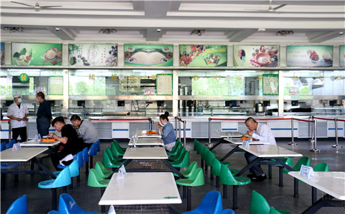 临近中午12时,怀远校区、贺兰山校区、文萃校区食堂出现了久违的学生身影。同学们有的自带饭盒,有的选择在食堂就餐。同学们在食堂门口经体温检测、消毒后进入食堂。按照指定出入口标识,大家单向循环有序进出,并按照地面1米线标识排队,始终与他人保持距离。