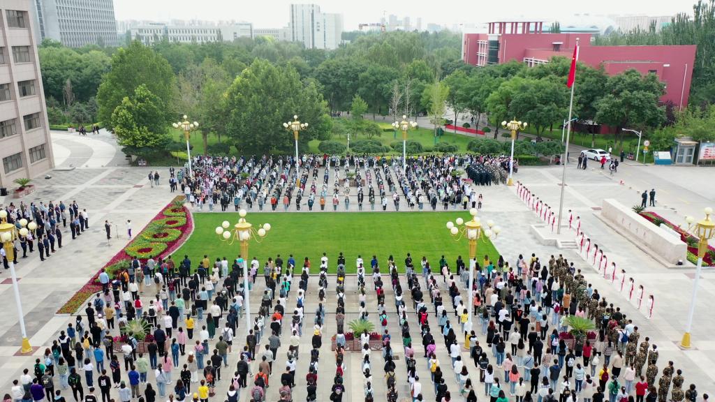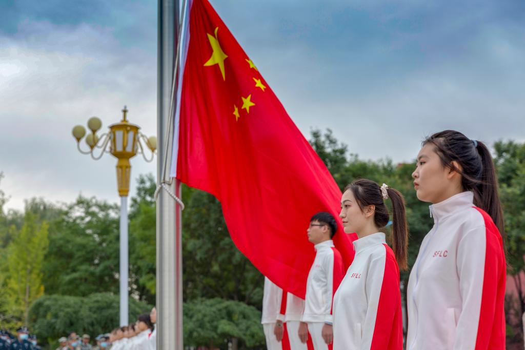 伴着庄严的中华人民共和国国歌,升旗手奋力挥臂将国旗抛向空中,鲜艳的五星红旗冉冉升起,时隔8个月重返校园的全体师生以崇高的注目礼向国旗、向祖国致敬。