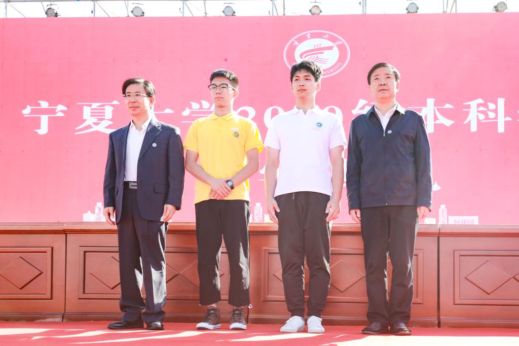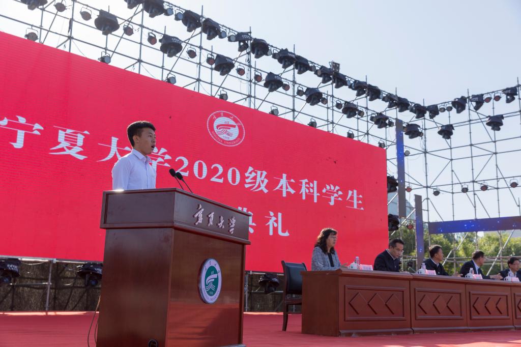 站在已然开启的未来大门前,土木与水利工程学院史龙和中卫校区文化旅游学院张刚代表新生表达了以宁大人的新身份来拥抱新知、探寻梦想的欣喜,并郑重承诺,将以“尚德勤学,求是创新”的宁大校训和“沙枣树”精神为行事准则和奋斗目标,以接好一代代宁大人手中的接力棒为义不容辞的使命,练就过硬本领,锤炼道德修养,勇担时代重任,不怕挫折、不惧挑战、持续奋斗,在火热的青春中放飞人生梦想,在拼搏的青春中成就人生华章,为学校发展、祖国繁荣贡献自己的青春力量。