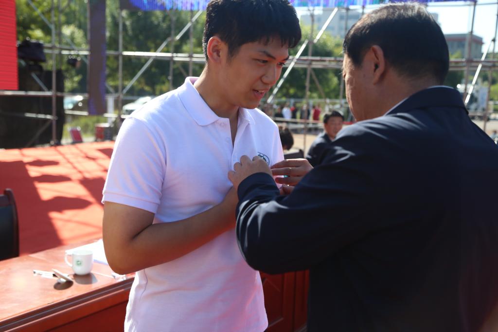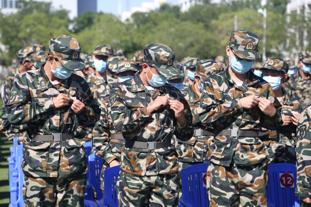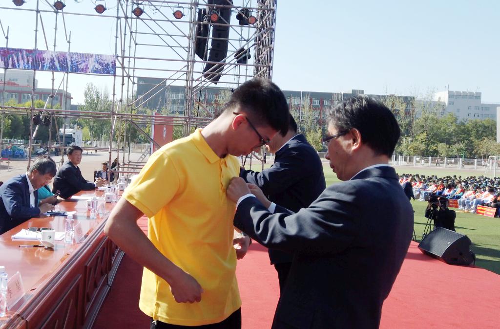 典礼仪式上,校党委书记李星、校长何建国为新生代表佩戴校徽,全体新同学现场集体佩戴校徽,并齐唱校歌。