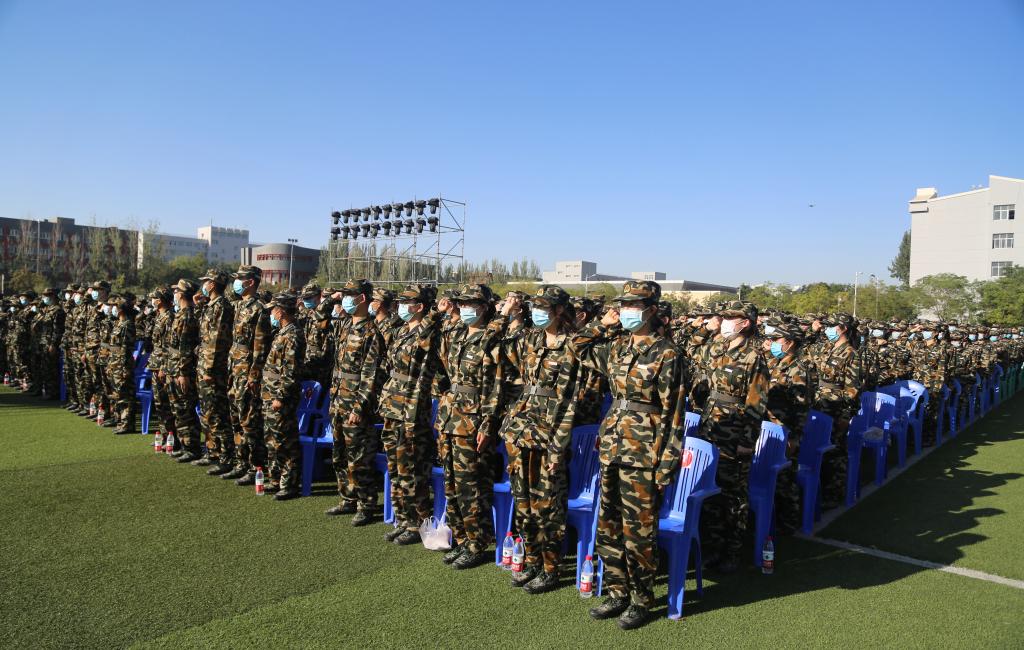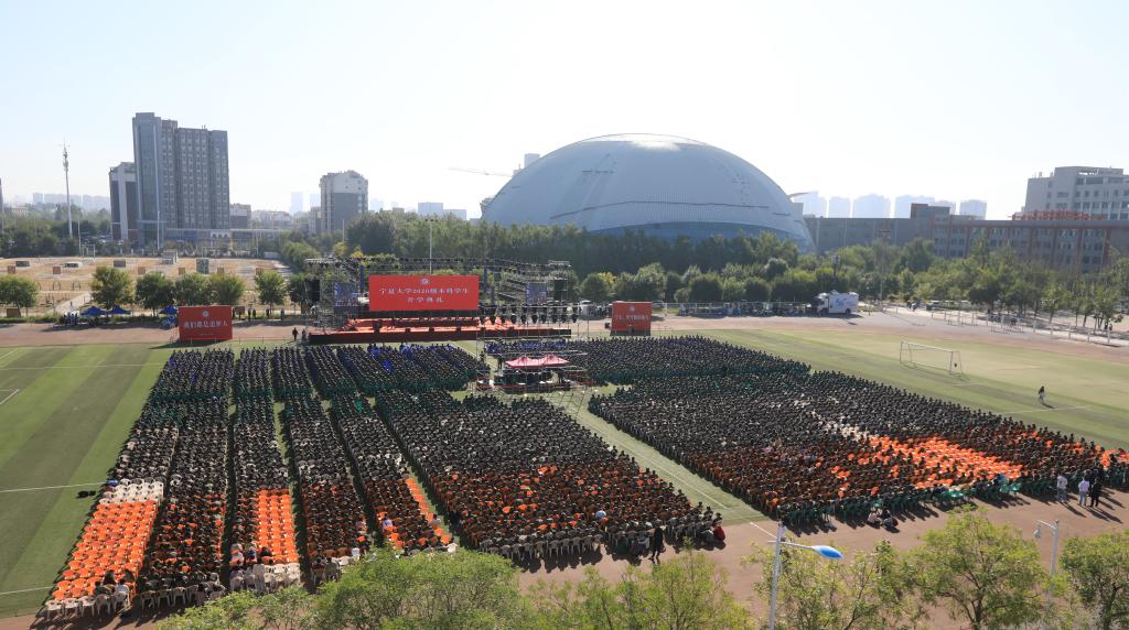 4390名新生在文萃校区体育场主会场参加典礼,518名新生在中卫校区应理报告厅视频分会场同步参加开学典礼。