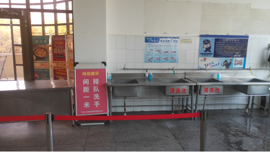 饮食服务中心针对就餐学生人数多的情况,切实保障校内饮食供应,确保饭菜价格稳定,严格按照食品安全要求,规范生产加工环节;每天营业结束后,对餐厅内部及餐厨用具进行全方位消毒,规范餐厅食材的存放、保管工作,避免受污染;严格落实餐厅从业人员持有效健康证明上岗,做好餐厅从业人员的每班次的体温检测和洗手消毒;设置安全隔离带,引导师生做好手部清洁和测温工作,做到错峰打包用餐、防止聚集就餐。
