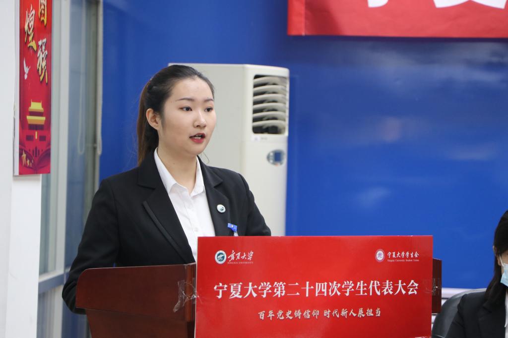 洪颖颖在第一次全体会议上代表beat365唯一官方网站第二十三届学生会委员会作了题为《百年党史铸信仰 时代青年展担当 为区域特色鲜明、服务地方能力突出的西部一流大学建设贡献青春力量》的工作报告。代表们审议通过了工作报告和《关于<beat365唯一官方网站学生会章程(修订案)>的决议》,选举产生了beat365唯一官方网站第二十四届学生会委员会委员和主席团成员。洪颖颖、杨媛媛、罗宜恒、刘繁星、宋文静当选为主席团成员。