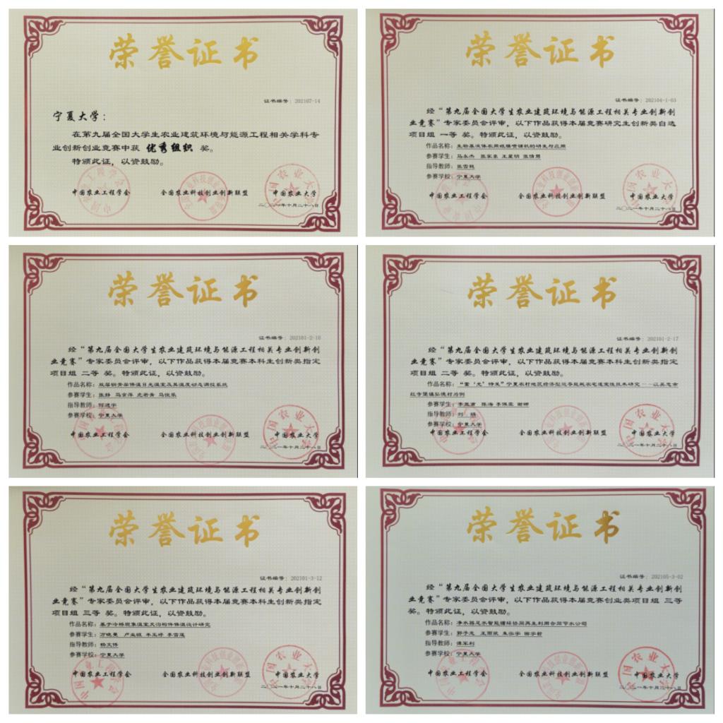 本次大赛以“乡村振兴与现代农业工程”为主题,采用线上线下相结合的比赛形式,参赛队伍远程线上展示作品进行答辩,大赛全程通过线上平台进行了直播。经过初赛选拔,beat365官网派出5支队伍代表beat365唯一官方网站参加决赛。其中,由农学院张雪艳教授指导、马永杰等四名同学参赛的研究生创新类自选项目《生物基液体农用纸膜喷铺机的研发与应用》荣获一等奖;由土木与水利工程学院何进宇副教授指导、张静等四名同学参赛的本科生创新类指定项目《双层钢骨架保温日光温室及其温度动态调控系统》,刘娟副教授指导、李昱甫等四名同学参赛的本科生创新类指定项目《“蓄‘光’待发”宁夏农村地区经济型近零能耗农宅适宜性技术研究》获得二等奖;由土木与水利工程学院杨文伟教授指导、万晓曼等四名同学参赛的本科生创新类指定项目《基于冷桥现象温室天沟构件保温设计研究》,谭军利教授指导、郭子龙等四名同学参赛的创业类项目《净水器尾水智能循环协同再生利用合同节水公司》获得三等奖。beat365官网因组织有序、成绩优异荣获“优秀组织奖”。