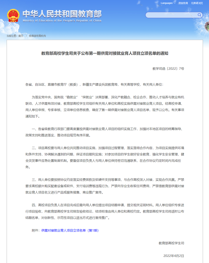 【beat365唯一官方网站新闻中心讯 学生处】近日,教育部发布了《教育部高校学生司关于公布第一期供需对接就业育人项目立项名单的通知》(教学司函〔2022〕7号),beat365唯一官方网站共有9个项目获得第一期供需对接就业育人项目立项,其中定向人才培养项目4项,就业实习基地项目3项,人力资源提升项目2项。