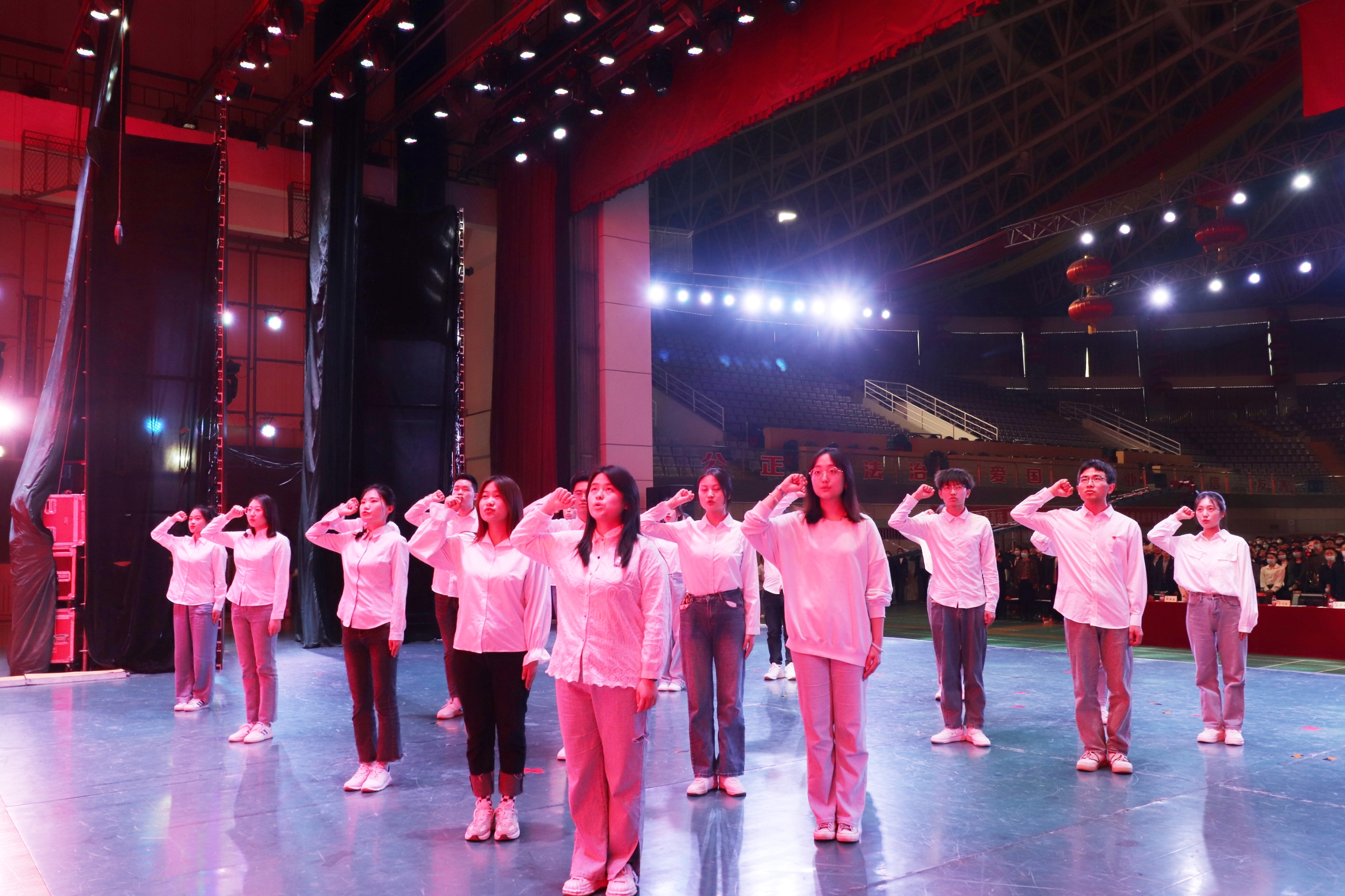 参会全体人员与台上团员代表一起面向团旗庄严宣誓,重温入团誓词。