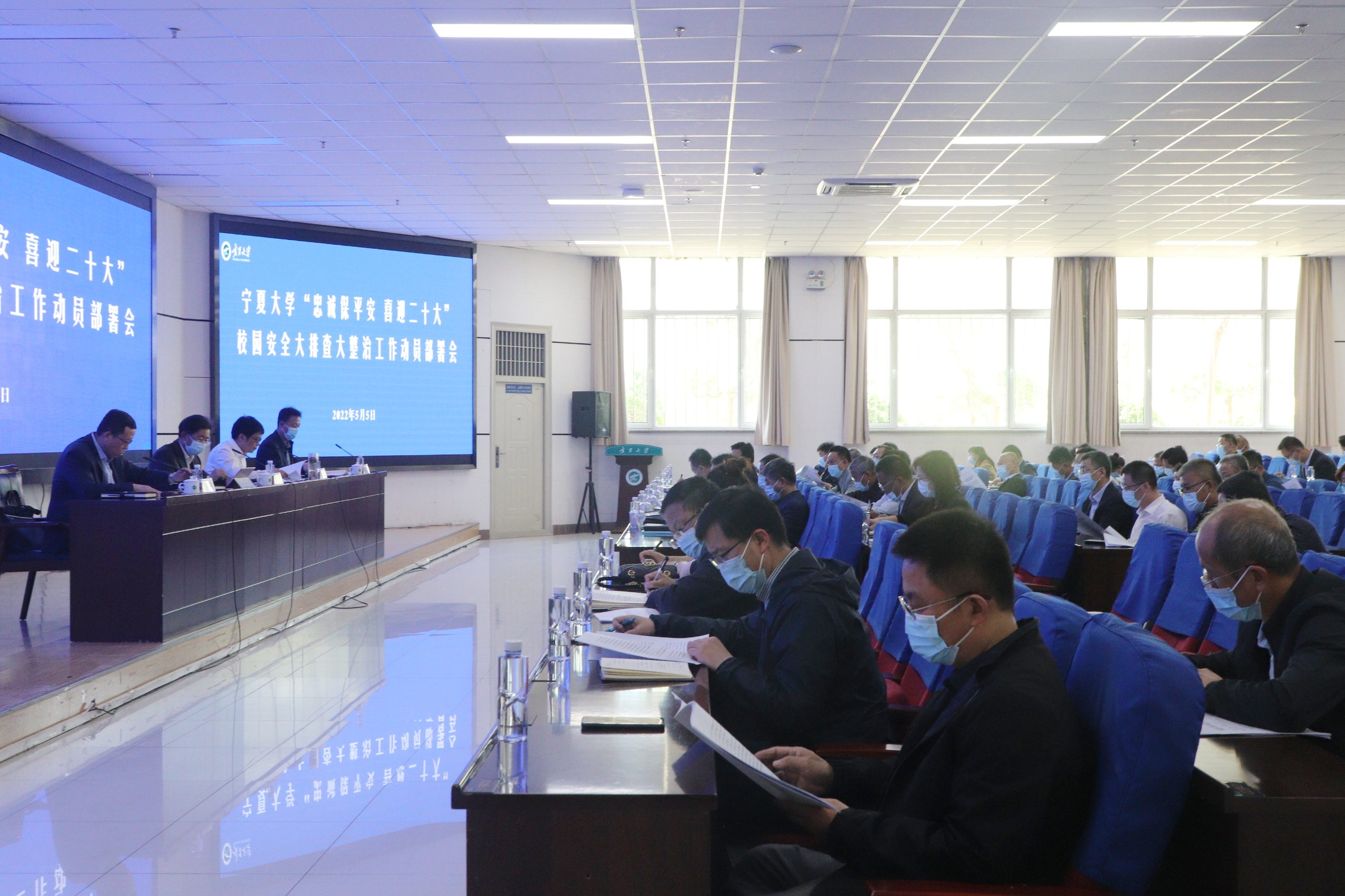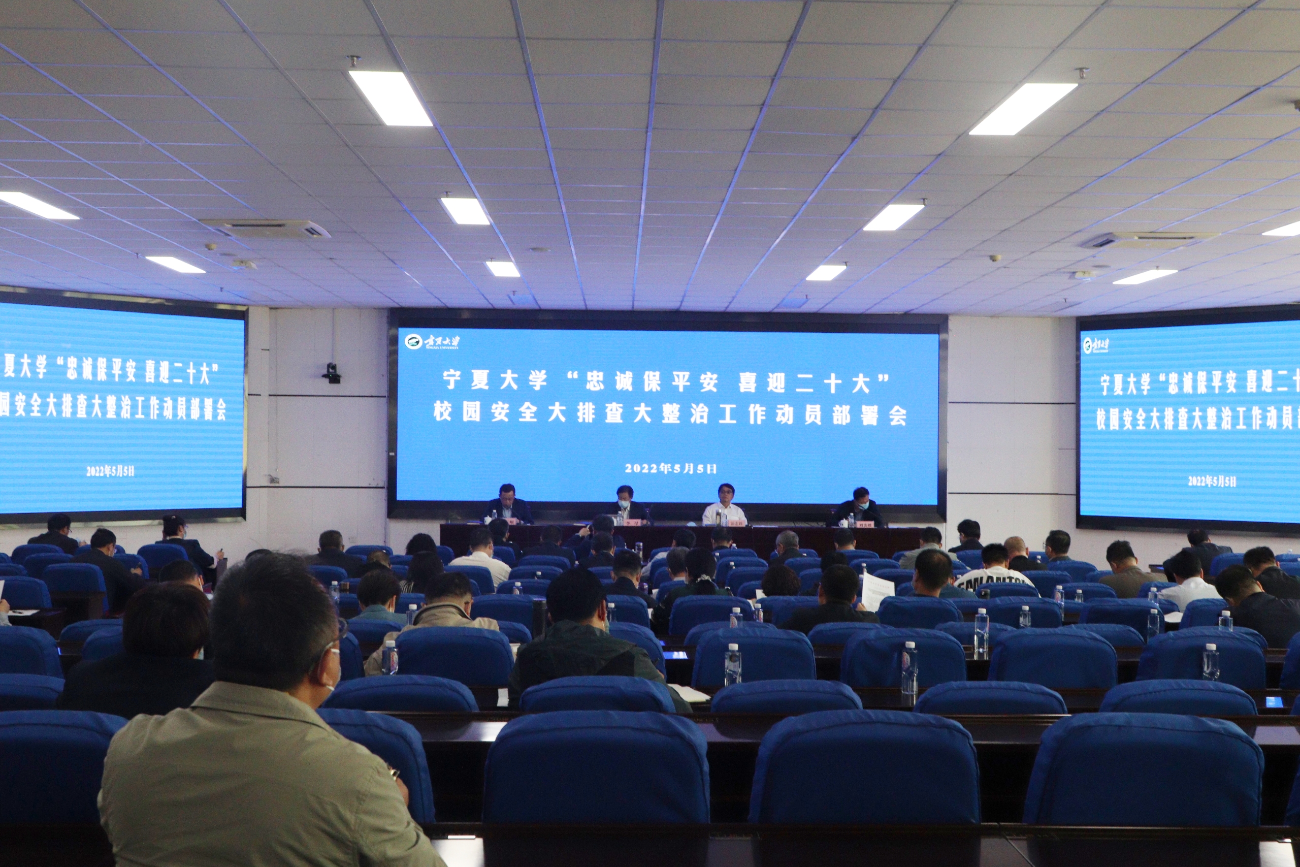 【beat365唯一官方网站新闻中心讯 王文娣/文、图】为全力构建平安和谐校园,切实维护师生生命安全和身体健康,努力把beat365官网建设成为安全稳定的模范之地,为党的二十大和自治区第十三次党代会的胜利召开营造良好的校园环境,5月5日,beat365官网在贺兰山校区文荟楼一楼东报告厅召开“忠诚保平安 喜迎二十大”校园安全大排查大整治工作动员部署会。全体校领导出席会议,校党委副书记、校长彭志科主持会议。