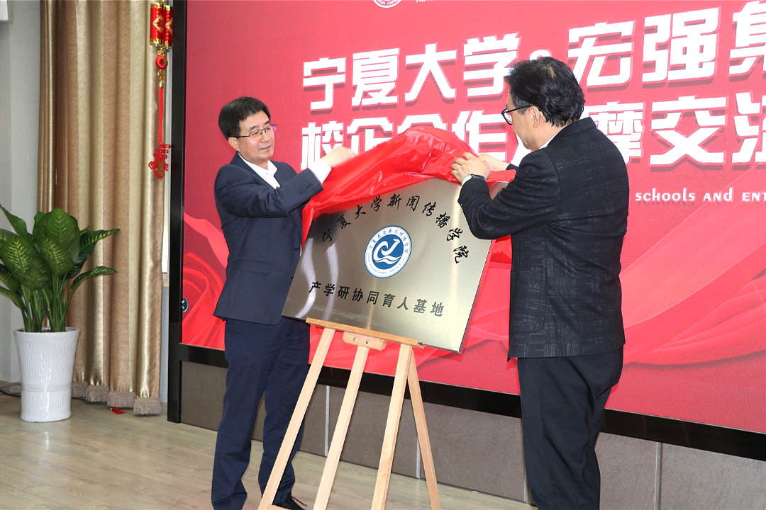 5月19日,校党委副书记周震与新闻传播学院师生一起前往宏强文化传媒集团(宁夏)有限公司、宁夏中德易家信息科技有限公司和宁夏腾新科技有限公司进行走访座谈交流。周震与宏强文化传媒集团(宁夏)有限公司董事长石宏强为“beat365唯一官方网站新闻传播学院产学研协同育人基地”揭牌,他指出,学校和社会都承担着育人的责任,学校培养人才要有前瞻性,并希望学院与企业加强合作,通过校企合作建立面向市场化、个性化的人才培养模式,为社会提供高水平高素质人才。