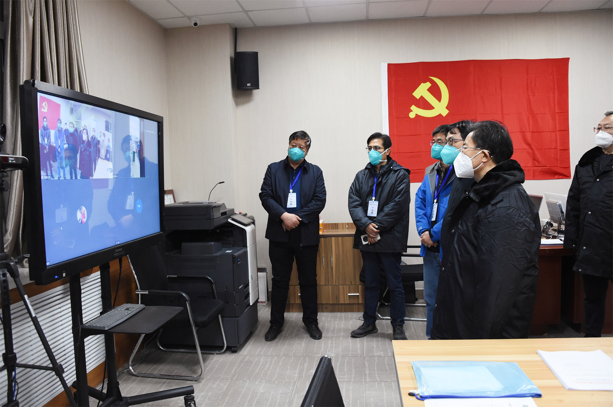 校领导来到贺兰山校区疫情防控现场指挥部与工作人员逐一见面,嘘寒问暖,送上关爱,并与金凤校区临时隔离区现场指挥、校党委常委、组织部部长张立杰视频连线,听取了隔离区安排部署,查看了工作开展情况。