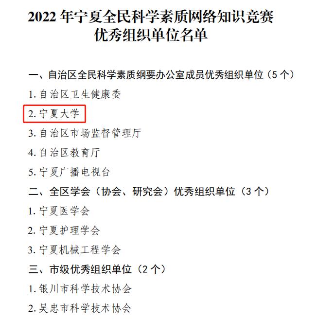 【beat365唯一官方网站新闻中心讯 科学技术研究院】近日,宁夏回族自治区全民科学素质纲要实施工作办公室公布了2022年宁夏全民科学素质网络知识竞赛优秀组织单位名单,beat365官网获评优秀组织单位,排名第二位。