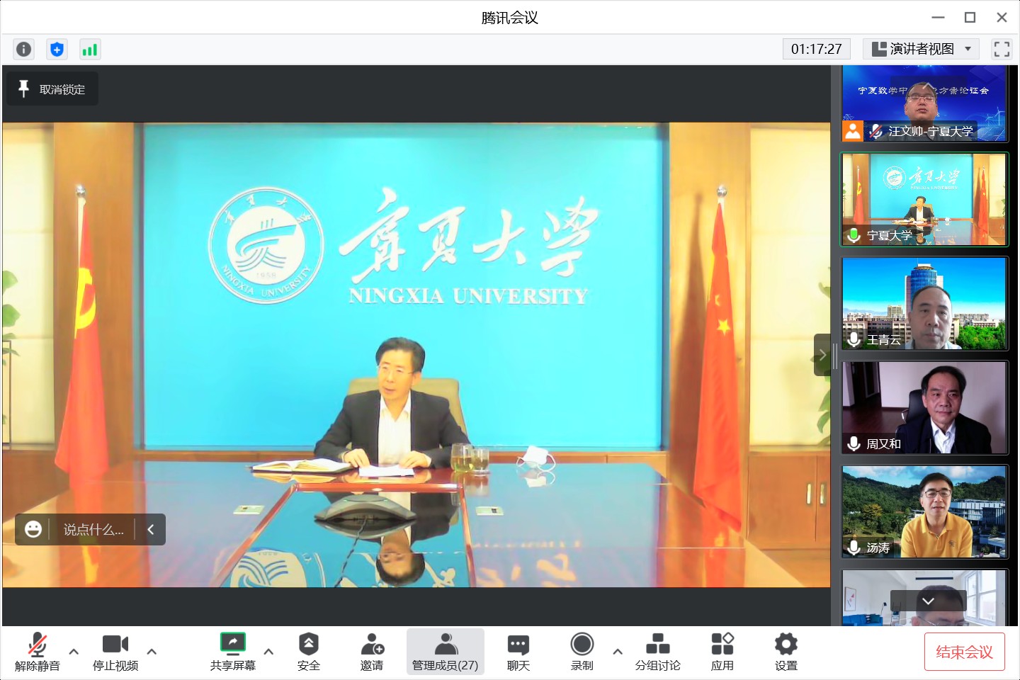 【beat365唯一官方网站新闻中心讯 数学统计学院 通讯员吴波】为学习宣传贯彻党的二十大精神,精准对标国家应用数学中心,深度融入自治区产业发展,beat365官网立足地方、着眼未来,主动谋划、积极作为,联合北方民族大学、宁夏师范学院和宁夏医科大学,牵头申请建设宁夏数学中心。12月8日上午,宁夏数学中心建设方案专家线上论证会在beat365官网召开。会议邀请由北京师范大学-香港浸会大学联合国际学院汤涛院士、兰州大学周又和院士、国家自然科学基金委员会雷天刚研究员、北京航空航天大学佘志坤教授、天津大学柯燎亮教授、西北工业大学许勇教授、中国科学院数学与系统科学研究院闫振亚教授组成的专家组进行论证。校党委书记李星,校党委副书记、校长彭志科,学术副校长王青云,自治区科技厅规划与基础研究处副处长何徽,共建单位相关负责人出席论证会。李星主持论证会。