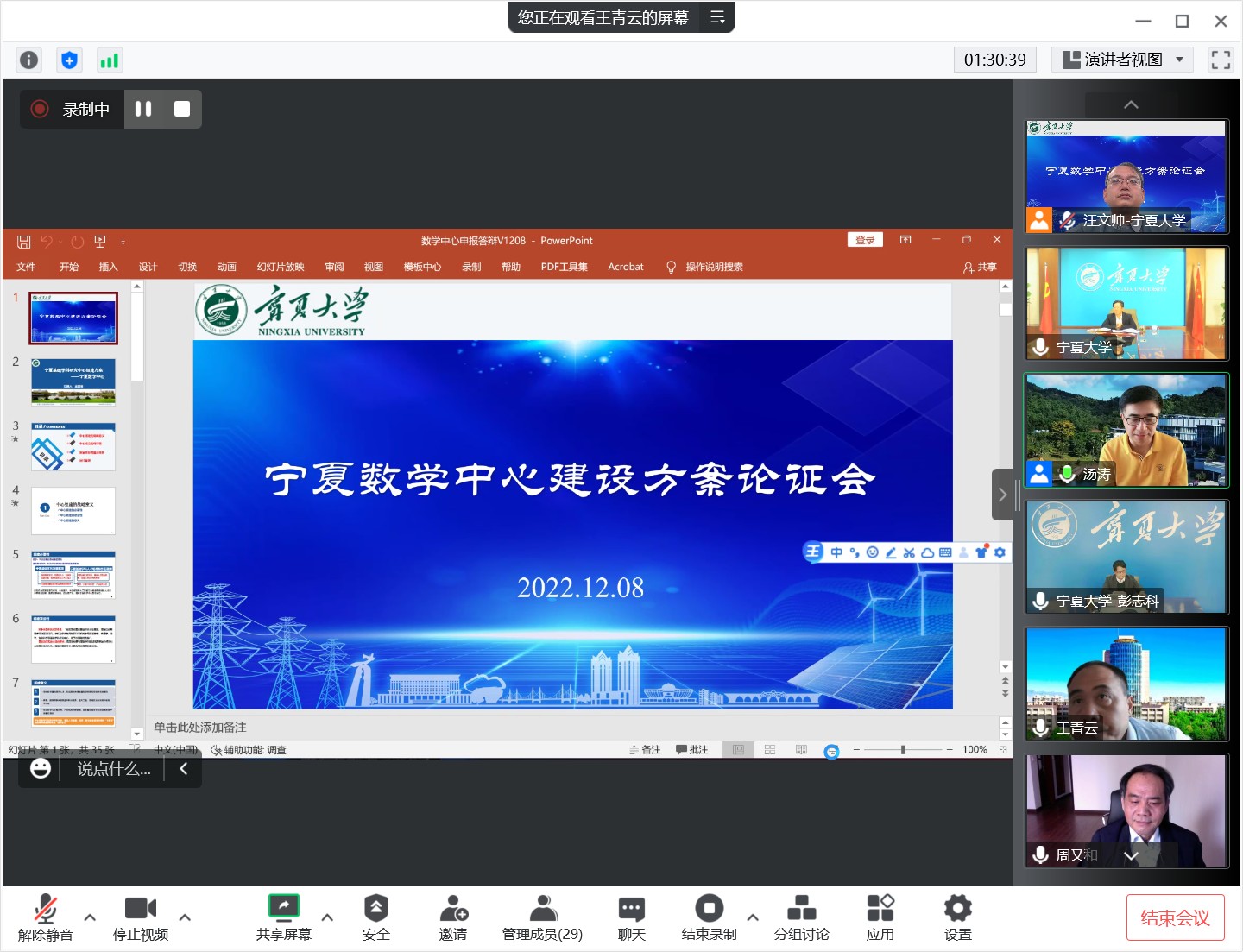 论证会上,专家组听取了中心主任王青云教授的建设方案汇报,并围绕宁夏数学中心建设方案的发展目标与重点任务、组织构架、人员组成、运行机制等重要内容进行了广泛深入讨论,提出建设性的建议和意见。专家们一致认为,方案满足《宁夏回族自治区基础学科研究中心建设管理办法》规定的各项条件,建议加快建设进度。