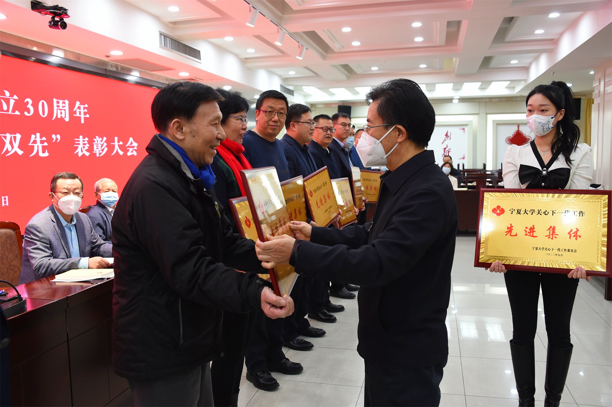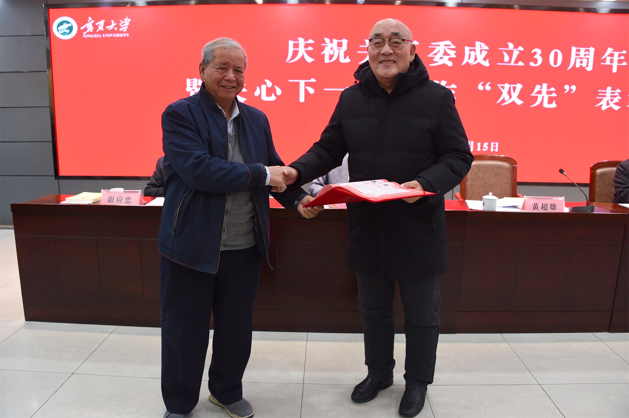 王玉炯宣读《关于颁发beat365唯一官方网站关工委“突出贡献奖”和表彰“关心下一代工作先进集体和先进个人”的决定》,与会领导为荣获“突出贡献奖”的学校原关工委主任刘世俊、刘青儒、赵维素三位老同志的代表,以及获得先进工作集体和个人荣誉的代表颁奖。