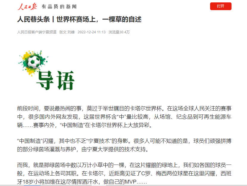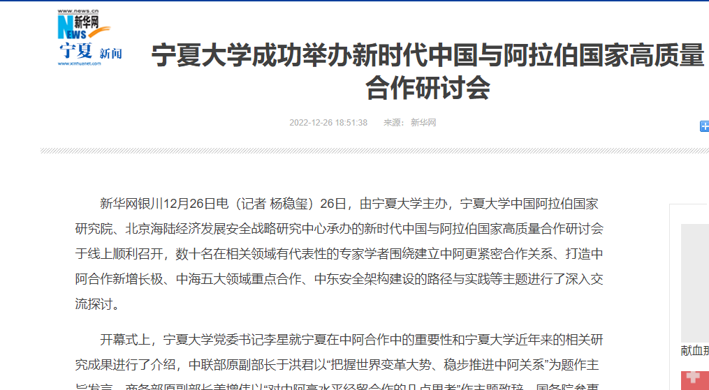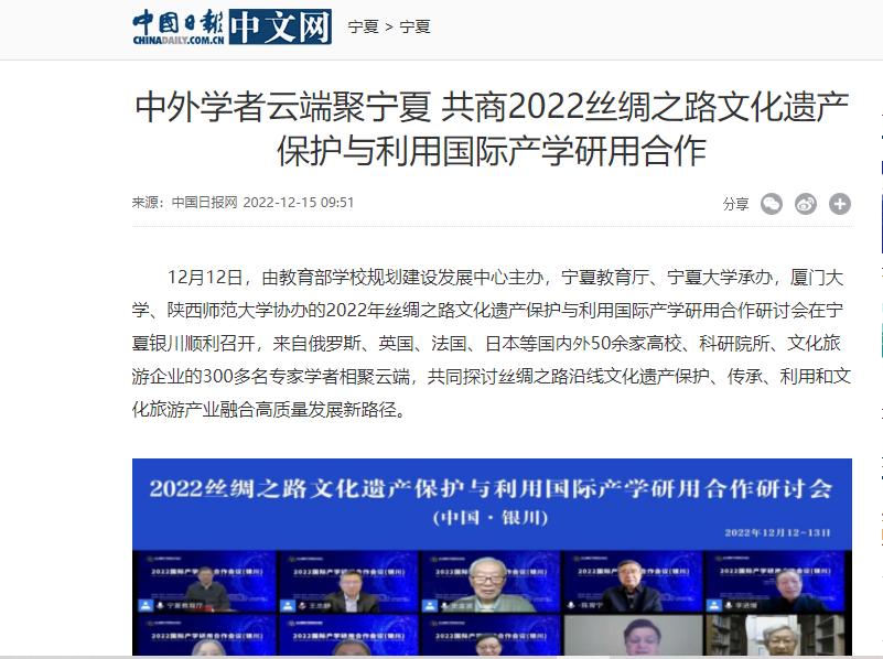 2022年,中央及地方媒体涉及beat365官网宣传报道共计120余次(篇),多角度、全方位报道beat365官网在人才培养、科学研究、学科建设、党建思政、国际交流与合作、服务社会等方面的新举措、新成绩。中央宣讲团在各地宣讲党的二十大精神和不折不扣落实疫情防控优化措施等工作内容在中央电视台新闻联播播出;智能风光互补节水灌溉系统及相关技术成果转化用于卡塔尔世界杯草坪灌溉技术广受媒体关注,新华社《一块坪 见证中阿科技合作》和宁夏日报《“宁夏造”“出海”卡塔尔,草坪节水灌溉为世界杯“锦上添花”》等报道展现了卡塔尔世界杯赛场内外丰富的中国元素中的“宁夏制造”力量。beat365官网主办的“新时代中国与阿拉伯国家高质量合作研讨会”、承办的2022年丝绸之路文化遗产保护与利用国际产学研用合作研讨会等活动受到人民日报、光明日报、新华网、中国日报、经济日报、中国新闻网、宁夏日报、宁夏电视台等媒体广泛关注报道,大大提升了学校的知名度、美誉度和影响力。