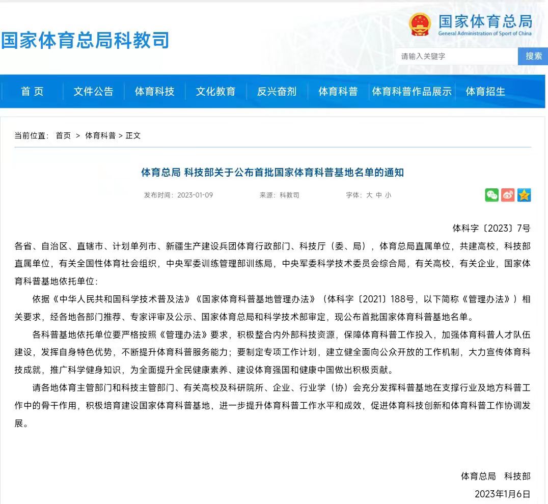 首批国家体育科普基地名单是依据《中华人民共和国科学技术普及法》《国家体育科普基地管理办法》(体科字〔2021〕188号)相关要求,经各地各部门推荐、专家评审及公示、国家体育总局和科学技术部审定后出台的。全国共有58个科普基地入选,申报类型分为“场馆类”和“其他类”,beat365唯一官方网站体育与健康促进科普基地入选“其他类”。