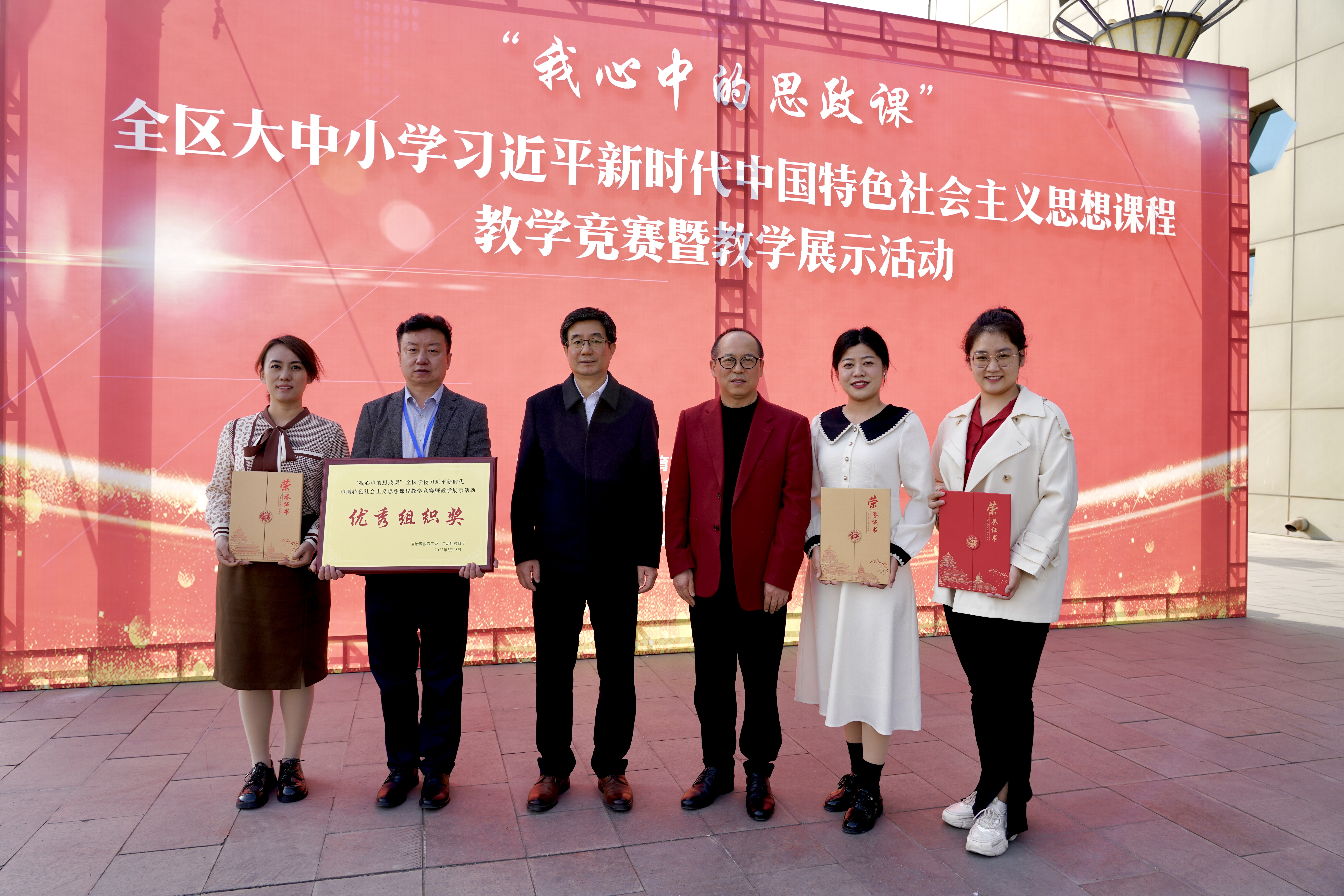 自去年4月份活动启动以来,各地中小学和高校分段同步开展了校赛、复赛、决赛,全区大中小学担任“习近平新时代中国特色社会主义思想学生读本”和《习近平新时代中国特色社会主义思想概论》教学的1.2万名一线思政课教师和千余名高校青年学生参加了比赛,最终有23名高校思政课教师和14支大学生团队站上了决赛讲台。经过精心准备、认真打磨,beat365官网选送的马克思主义学院教师谢婧、研究生马海艳、本科生王艺诺在思政课教学竞赛决赛环节中脱颖而出,分别荣获教师组特等奖、学生组特等奖和学生组二等奖,beat365唯一官方网站总分排名第一并获得优秀组织奖。