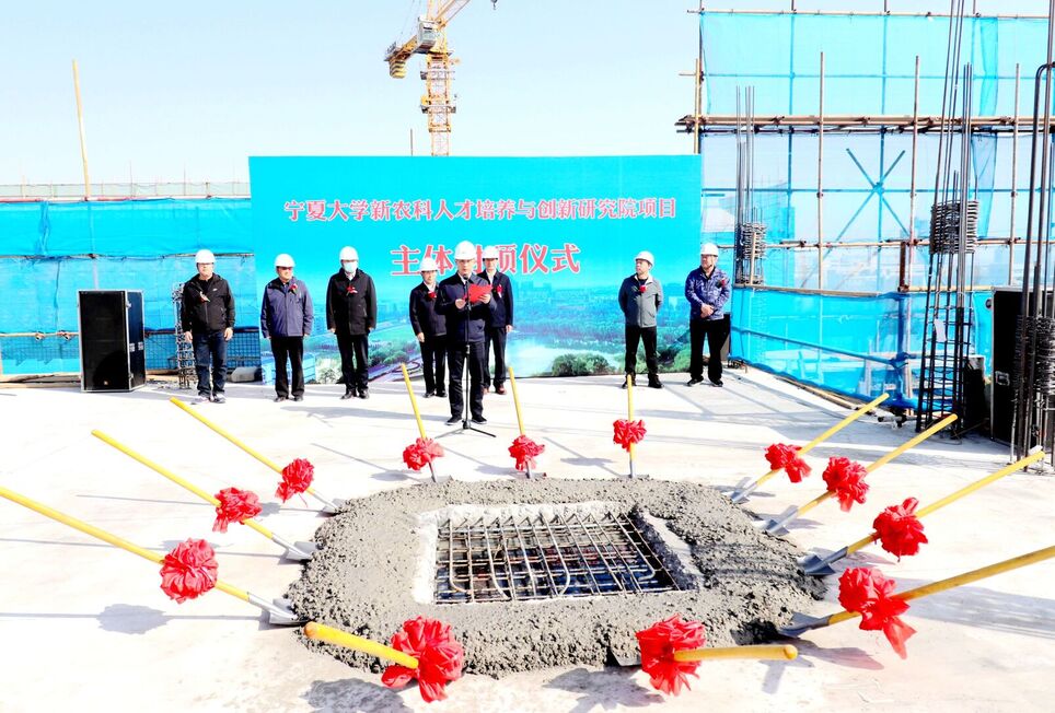【beat365唯一官方网站新闻中心讯 张景/文、张景 王文娣/图】在自治区发展改革委、财政厅、教育厅有关部门的大力支持和学校相关部门的通力协作下,历经10个多月的建设,beat365官网新农科人才培养与创新研究院项目主体施工任务顺利完成,取得阶段性成果。3月29日,新农科人才培养与创新研究院项目主体正式封顶,全体在家校领导出席封顶仪式。校党委常委、副校长史金龙主持封顶仪式。