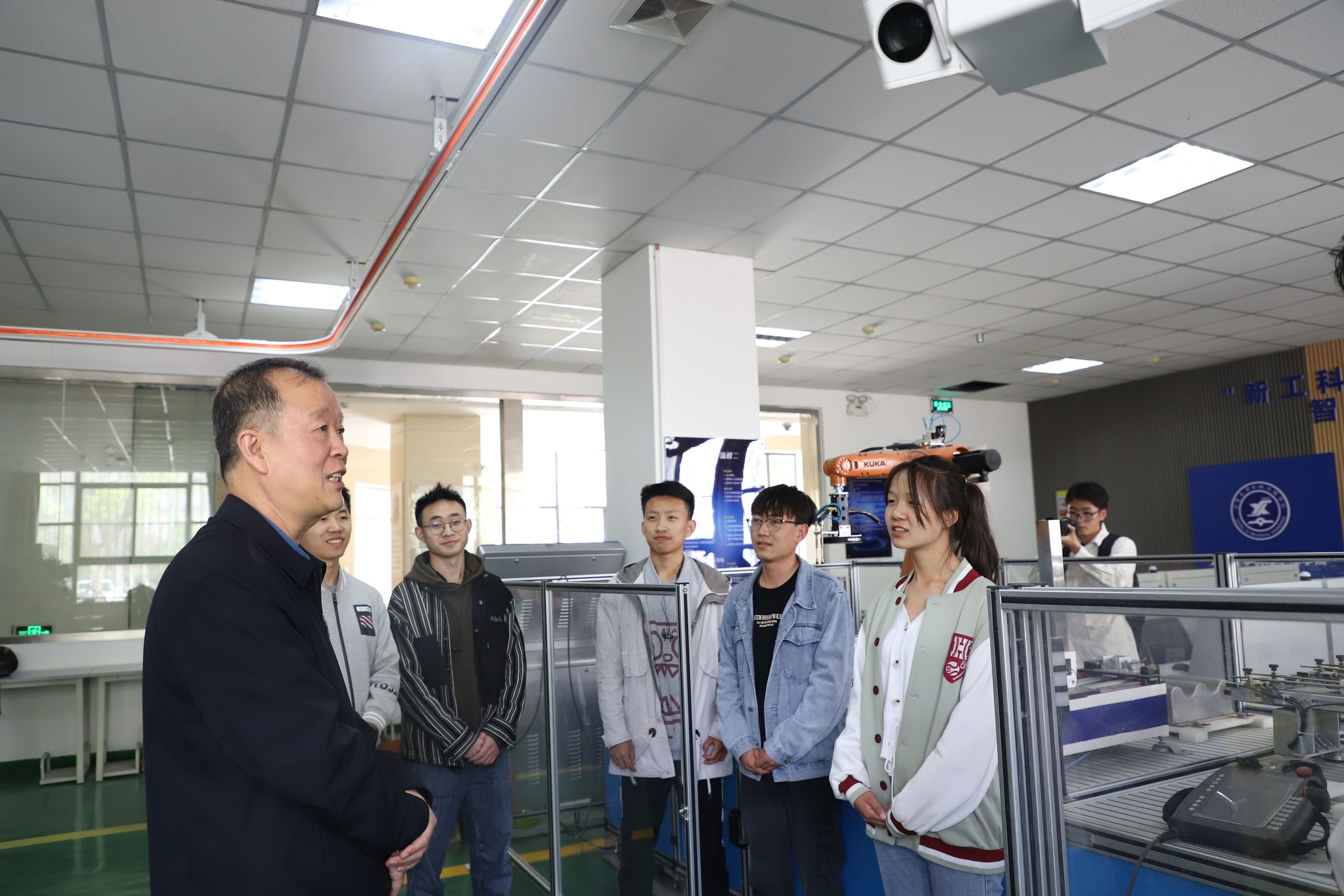 在开展专题宣讲报告之前,张虎来到机械学院一楼智能制造室进行参观并与学院学生就科技创新进行现场交流讨论。