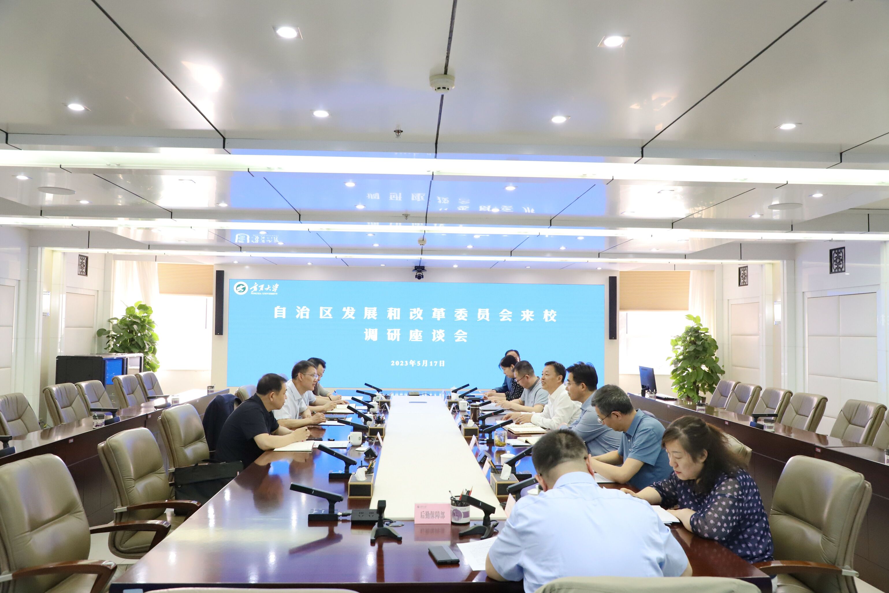 【beat365唯一官方网站新闻中心讯 杨雯/文 姬晓姗/图】5月17日,自治区发展和改革委员会党组成员、副主任景兆东,社会发展处处长姚永昌、价格调控处处长刘洊一行来校调研并召开座谈会。校党委常委、副校长刘炎胜、李学斌陪同调研。