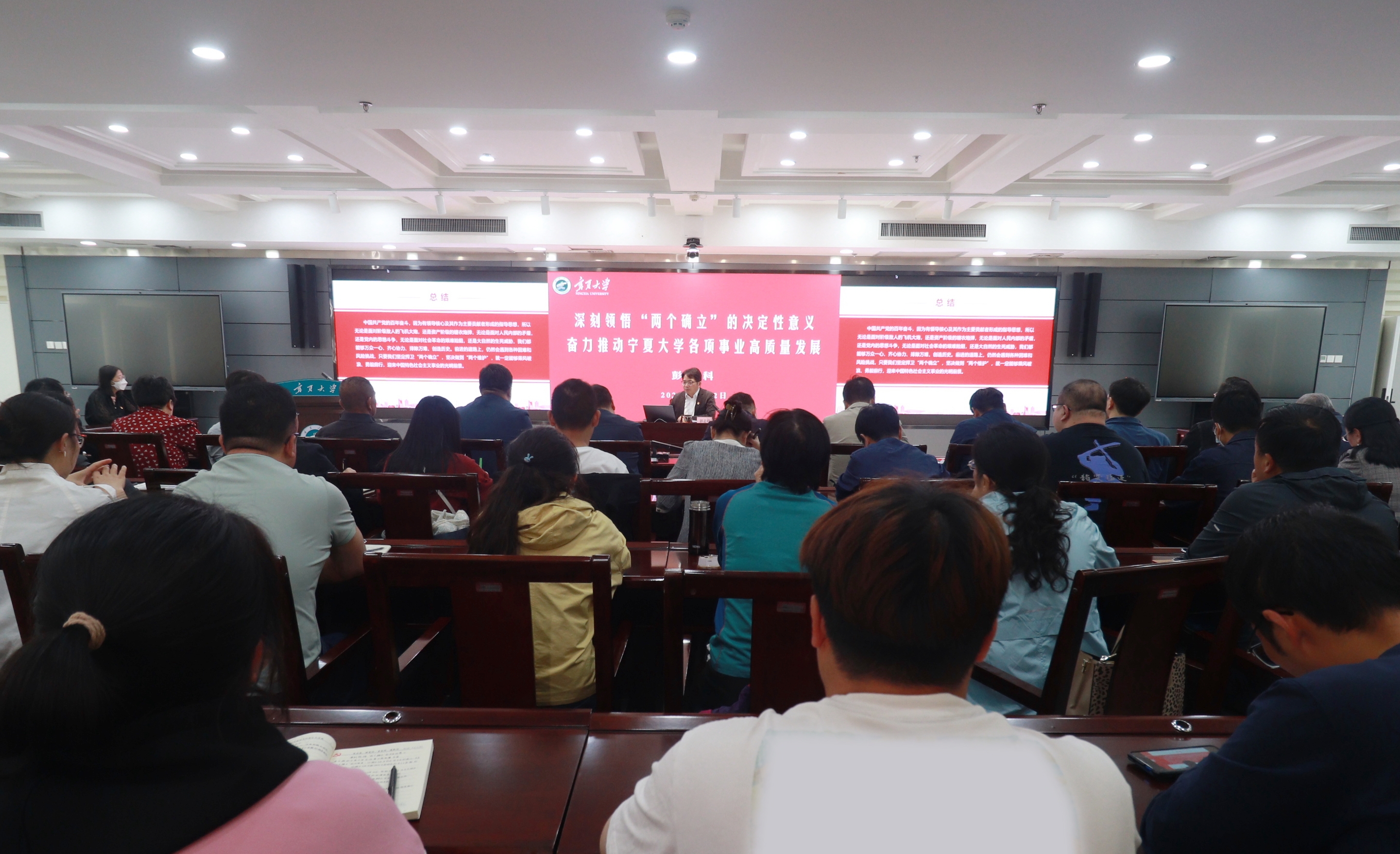 校党委常委、副校长王忠静以《学习建党百年历史 迎接中华民族伟大复兴使命 领会黄河流域生态保护和高质量发展意义 为先行区建设努力前行》为题,阐述了黄河流域保护和发展的重要意义,中国共产党领导下的黄河流域保护和发展历程及治理经验,宁夏黄河流域生态保护和高质量发展先行区建设的宝贵实践和经验。他强调,要牢固树立“一盘棋”思想,加强重大问题研究,着力创新体制机制,为自治区建设黄河流域生态保护和高质量发展先行区贡献力量。