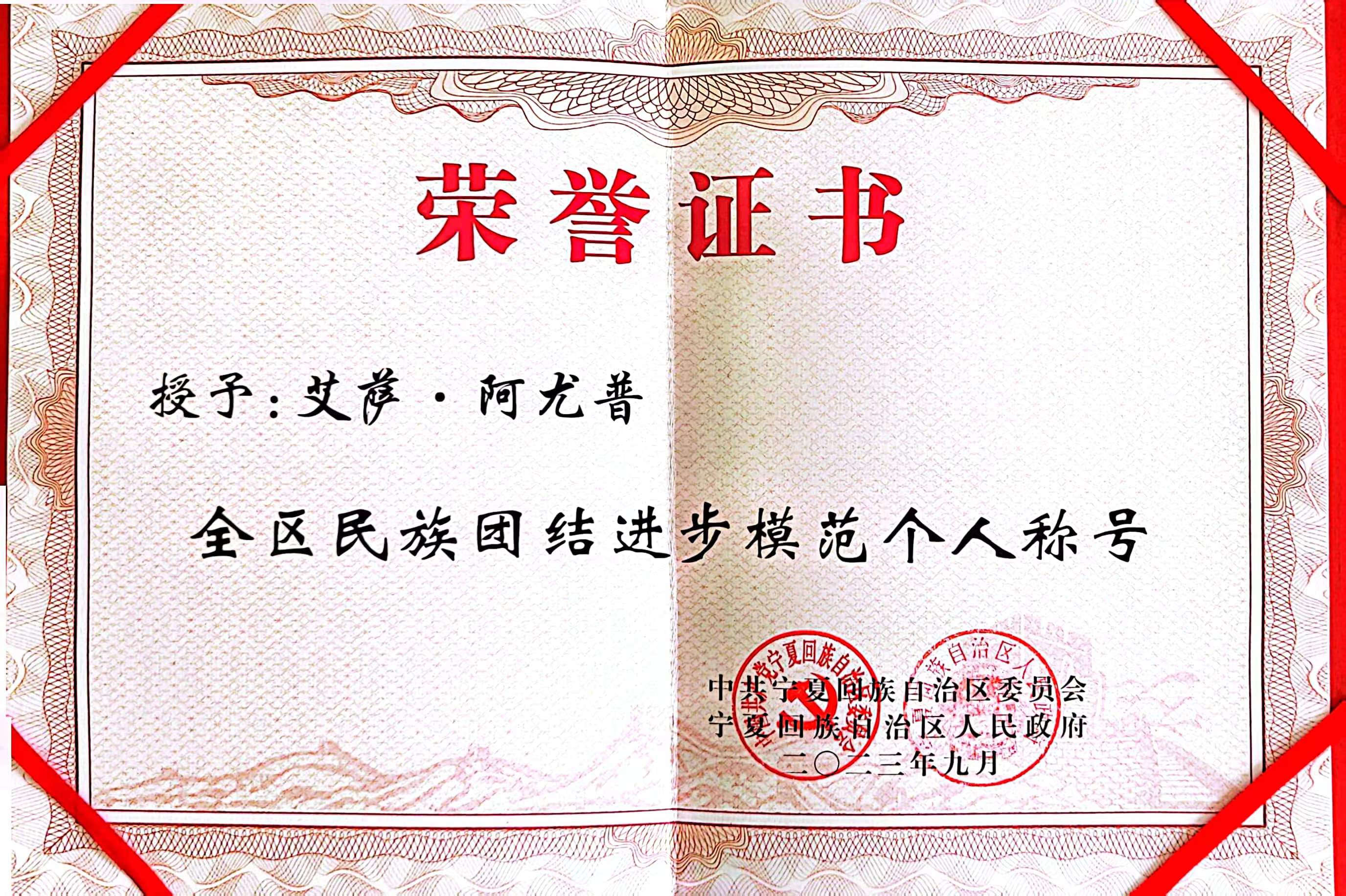 【beat365唯一官方网站新闻中心讯 党委统战部】9月11日,全区第九次民族团结进步表彰大会在银川召开,对近年来为民族团结进步事业做出突出贡献的模范集体和模范个人进行了表彰。beat365官网勤学书院辅导员艾萨·阿尤普荣获“全区民族团结进步模范个人称号”。