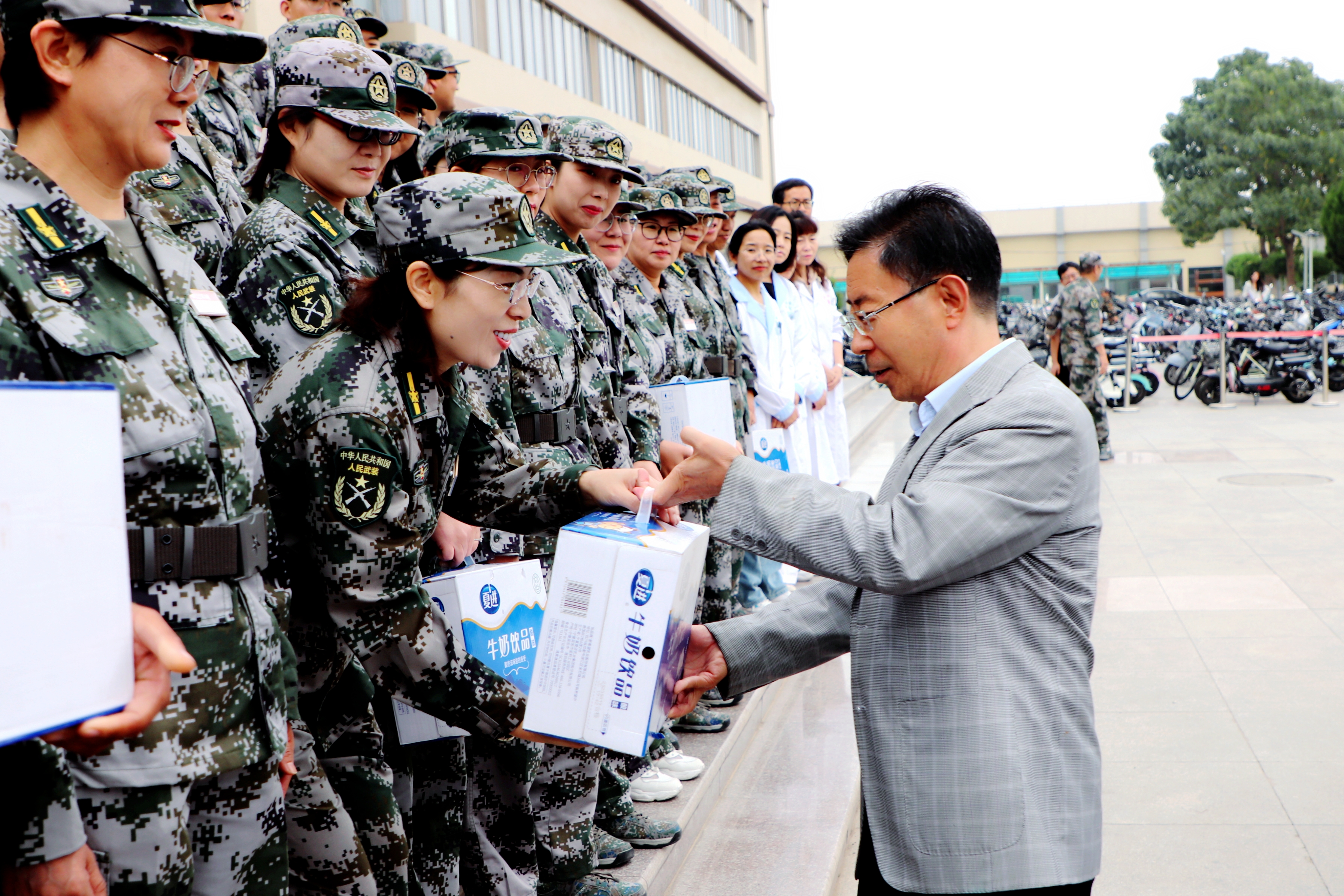 【beat365唯一官方网站新闻中心讯 张景/文图】连日来,beat365官网2023级学生在承训教官、参训教师的精心指导下,团结一心、不惧困难,认真完成各项训练任务,展现出严明的纪律作风和良好的精神风貌。9月8日,在全国第39个教师节即将来临之际,校党委书记李星,党委副书记周震,党委常委、副校长黄河一行前往怀远校区逸夫图书馆“五四”广场慰问已参训两周的承训教官和教师代表。