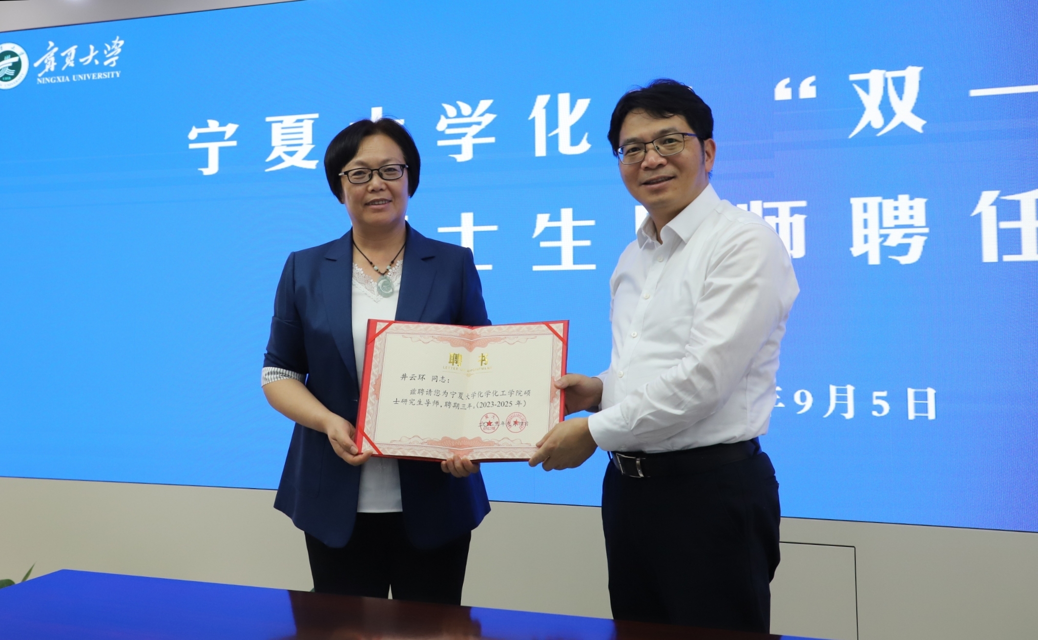 【beat365唯一官方网站新闻中心讯 王文娣/文、图】9月5日下午,beat365官网在贺兰山校区德勤楼举行化工“双一流”学科硕士生导师聘任仪式。校党委副书记、校长彭志科,学术副校长、化学化工学院院长罗正鸿,国能集团宁煤煤化工研究院副院长袁炜,纪委书记、副院长雍晓静,副总工程师井云环、庄壮出席聘任仪式。化学化工学院党总支书记、常务副院长张鹏飞主持仪式。