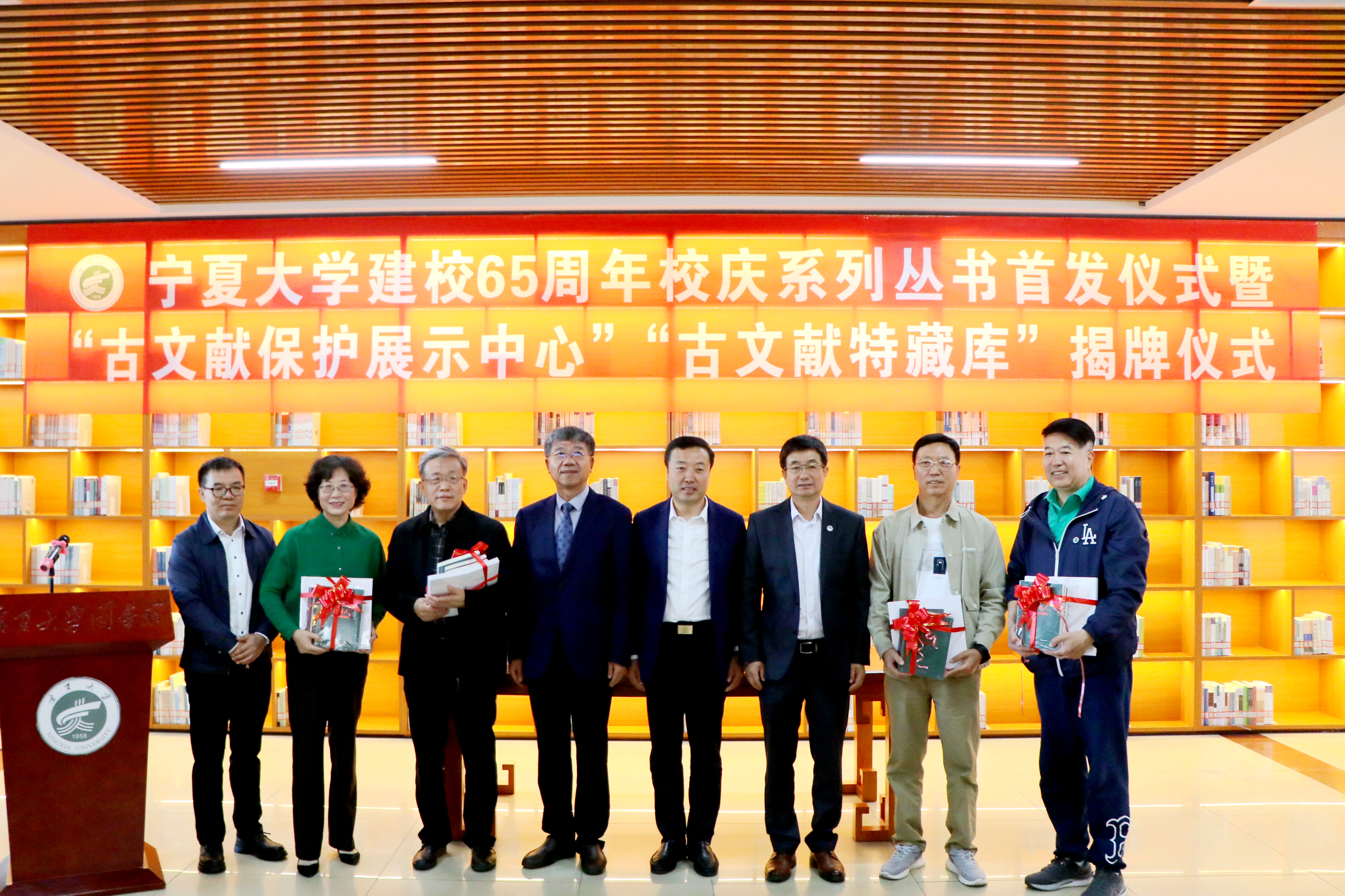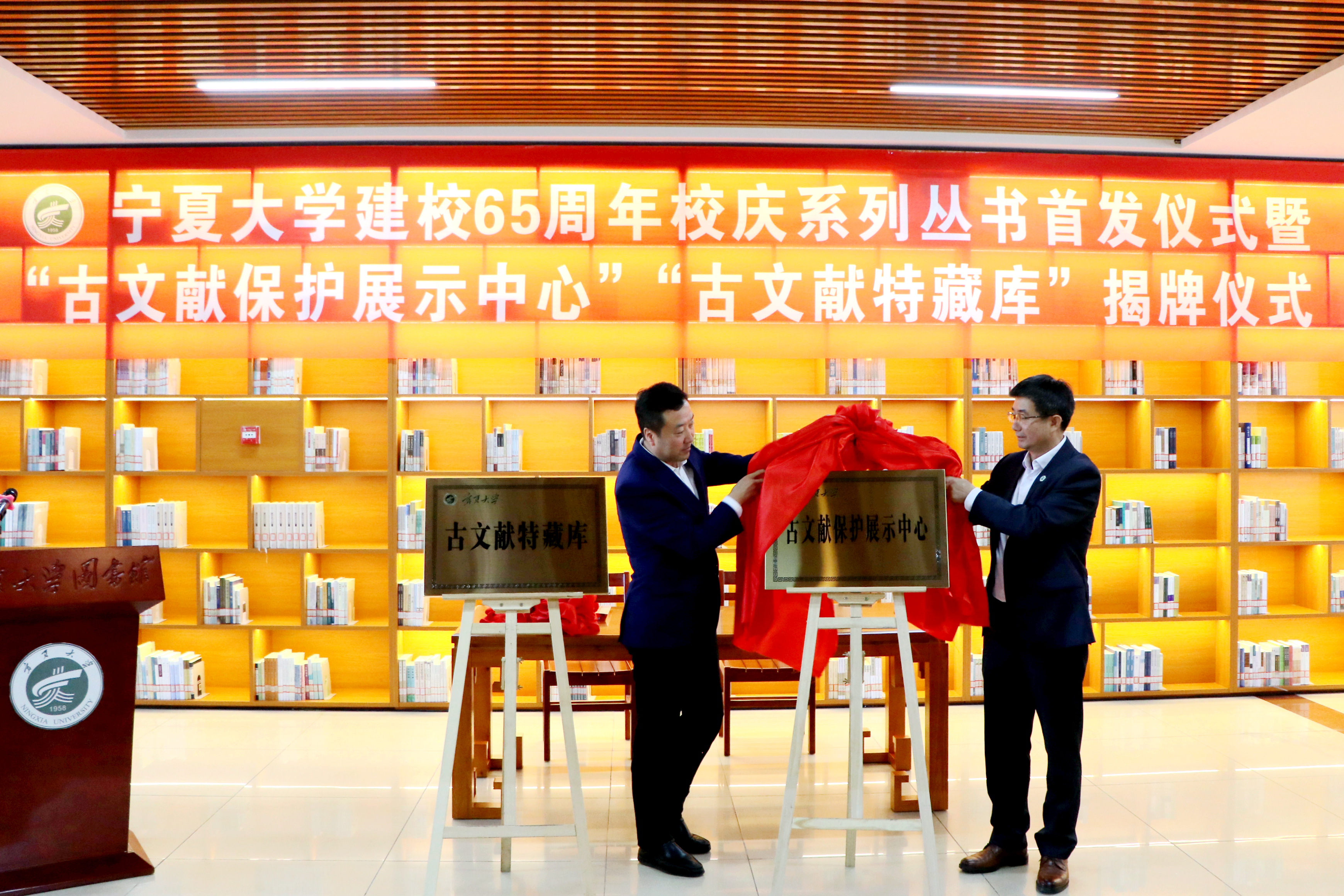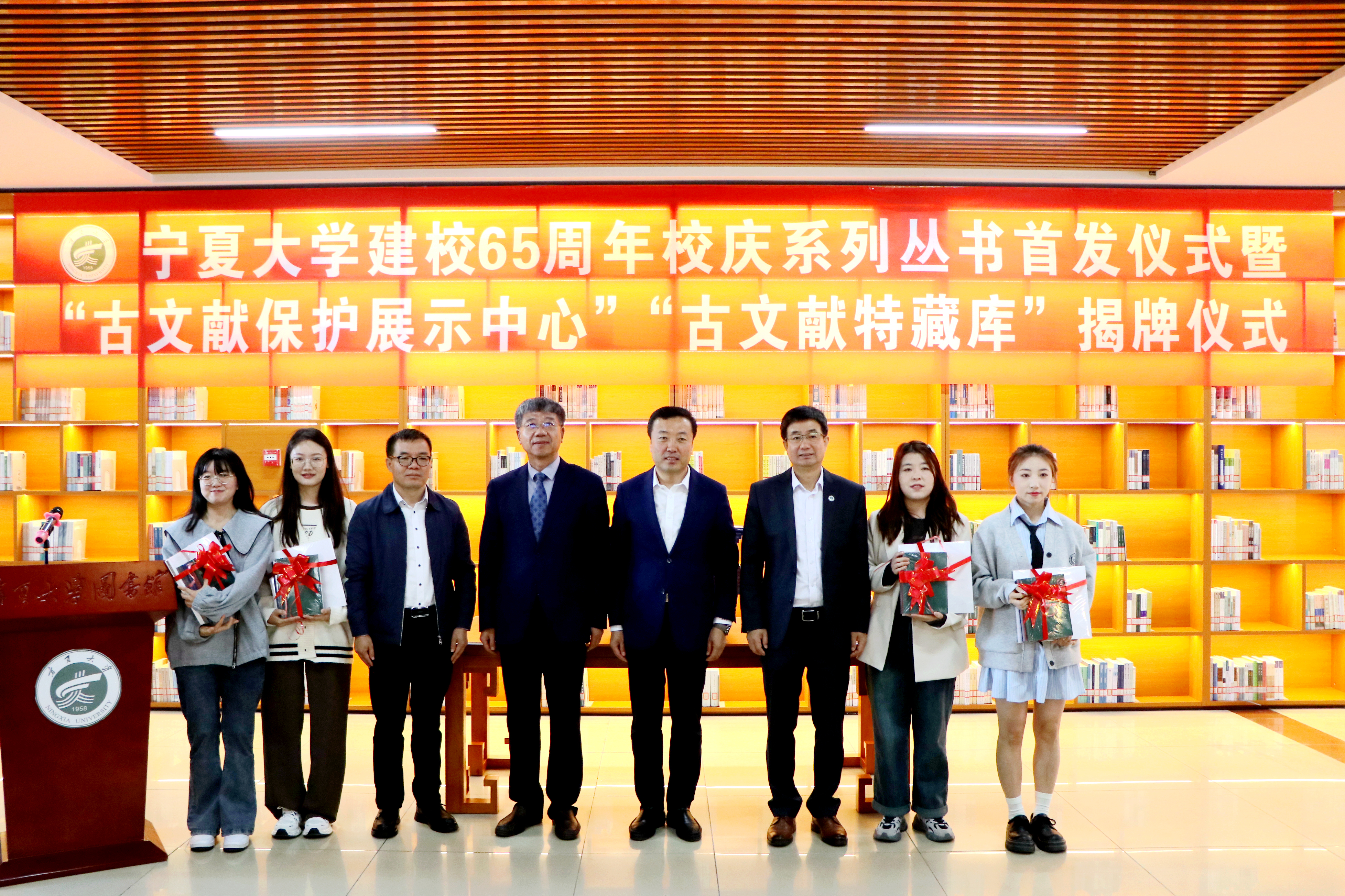 仪式现场,马英俊、周震和黄河出版传媒集团阳光出版社副总编辑周立军为65周年校庆系列丛书《贺兰山下种树人--beat365唯一官方网站口述实录》(第一辑至第四辑)《欲栽大木柱长天--镜头里的beat365唯一官方网站》首发揭幕并向师生代表赠书。马英俊、周震为beat365唯一官方网站古文献保护展示中心、古文献特藏库揭牌。