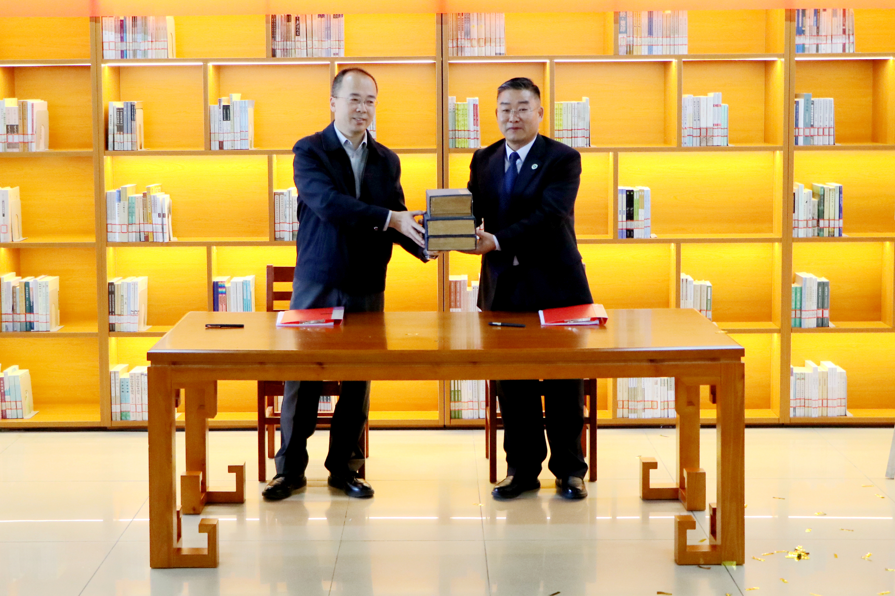 现场还举行了线装书籍交接仪式。文学院党总支书记王宏武与图书馆馆长苗福生签订了移交协议,文学院向图书馆共移交古籍等线装书籍2700余册。