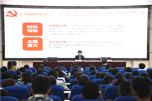 校党委副书记王玉炯主持报告会。他认为,报告既深刻全面又生动鲜明解读了四中全会精神,帮助师生深刻领会中国特色社会主义制度和国家治理体系的显著优势,为我们准确把握《决定》,抓好全会精神贯彻落实奠定了基础。他要求,学习宣传贯彻落实四中全会精神是我们当前和今后一个时期的重大政治任务。全校上下要深刻学习领会四中全会精神,并把四中全会精神贯彻落实到实际工作中。要认真开展全会精神学习宣讲工作。校党委理论宣讲团、各级党员领导干部要深刻学习领会全会精神,切实提高宣讲的针对性实效性,切实把广大师生的思想和行动统一到四中全会精神上来,毫不动摇地坚持和巩固中国特色社会主义制度,提高依法治校,构建现代大学治理体系的能力。努力为加快教育现代化、建设教育强国、办好人民满意的教育贡献力量。