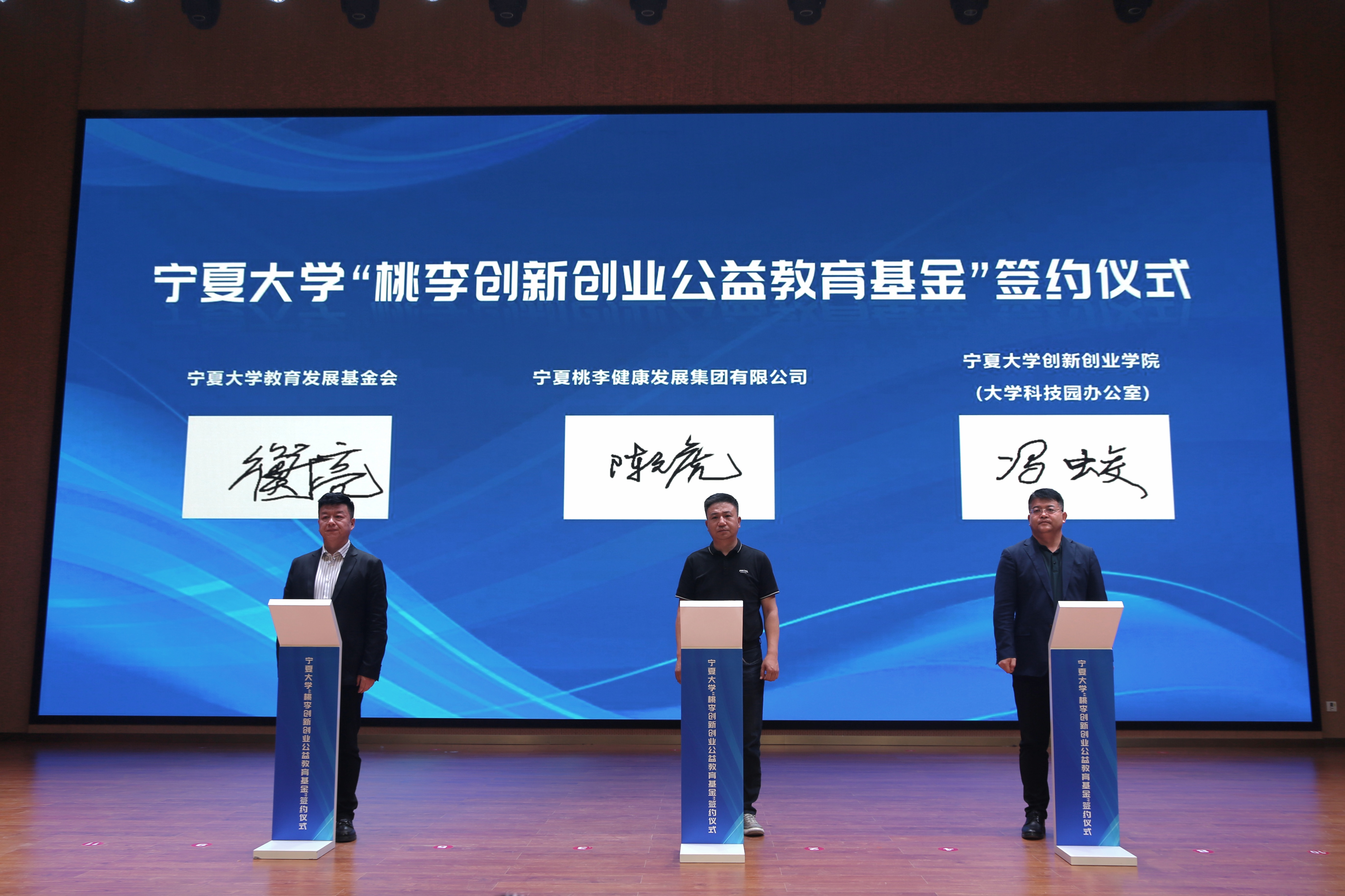 宁夏桃李公益基金会秘书长陈元虎、beat365唯一官方网站创新创业学院院长冯蛟、beat365唯一官方网站校友总会与教育发展基金会工作办公室主任衡亮现场进行电子签约。黄河、曹培、谢应忠和师生代表上台共同触摸水晶球,宣布“桃李创新创业公益教育基金”正式启动。