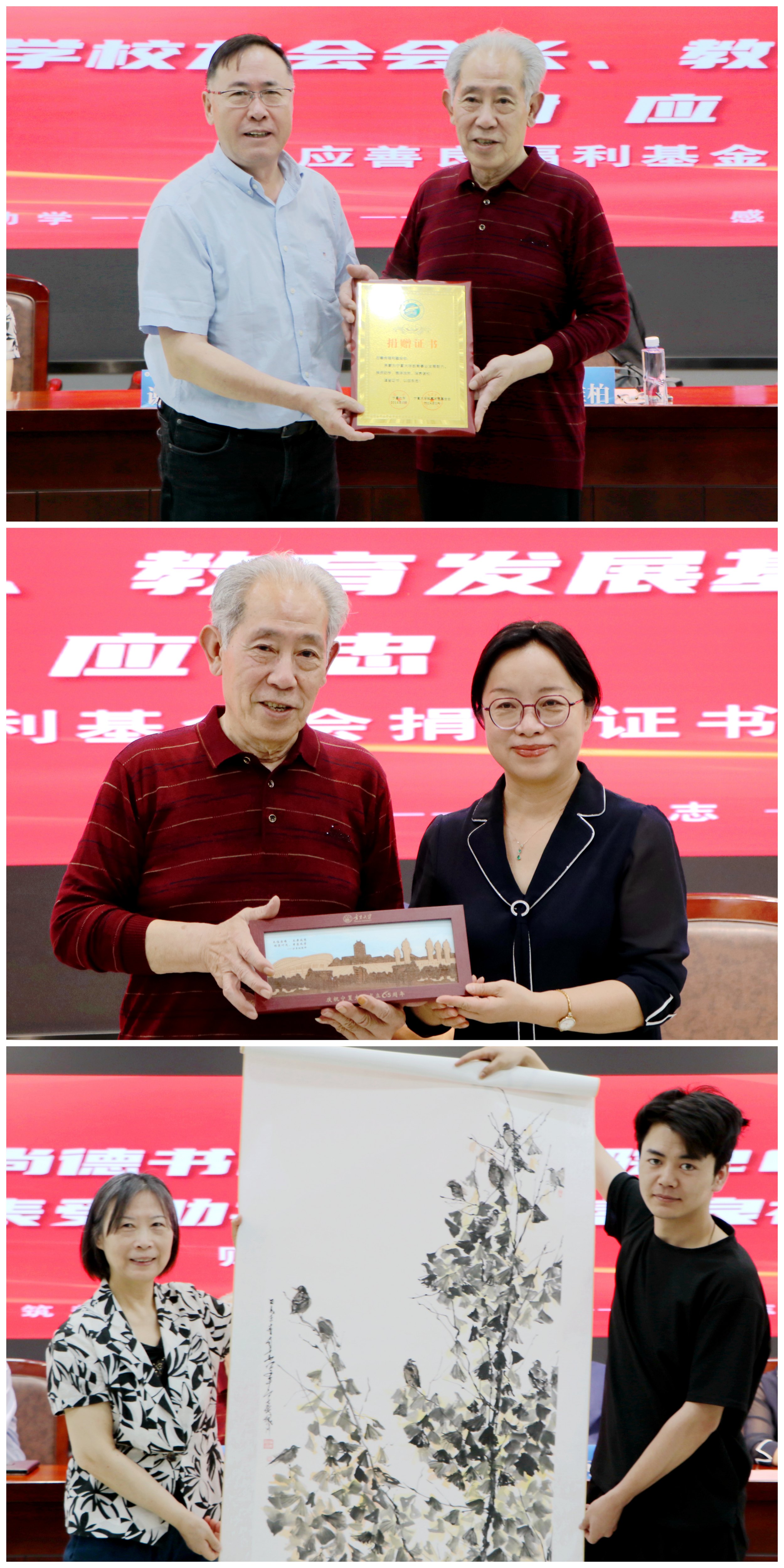 谢应忠向应善良福利基金会颁发捐赠证书,赵晓佳向应善良福利基金会赠送纪念品,美术学院(尚德书院)2021级国画专业蒲海龙代表受助学生向应善良福利基金会赠送绘画作品。
