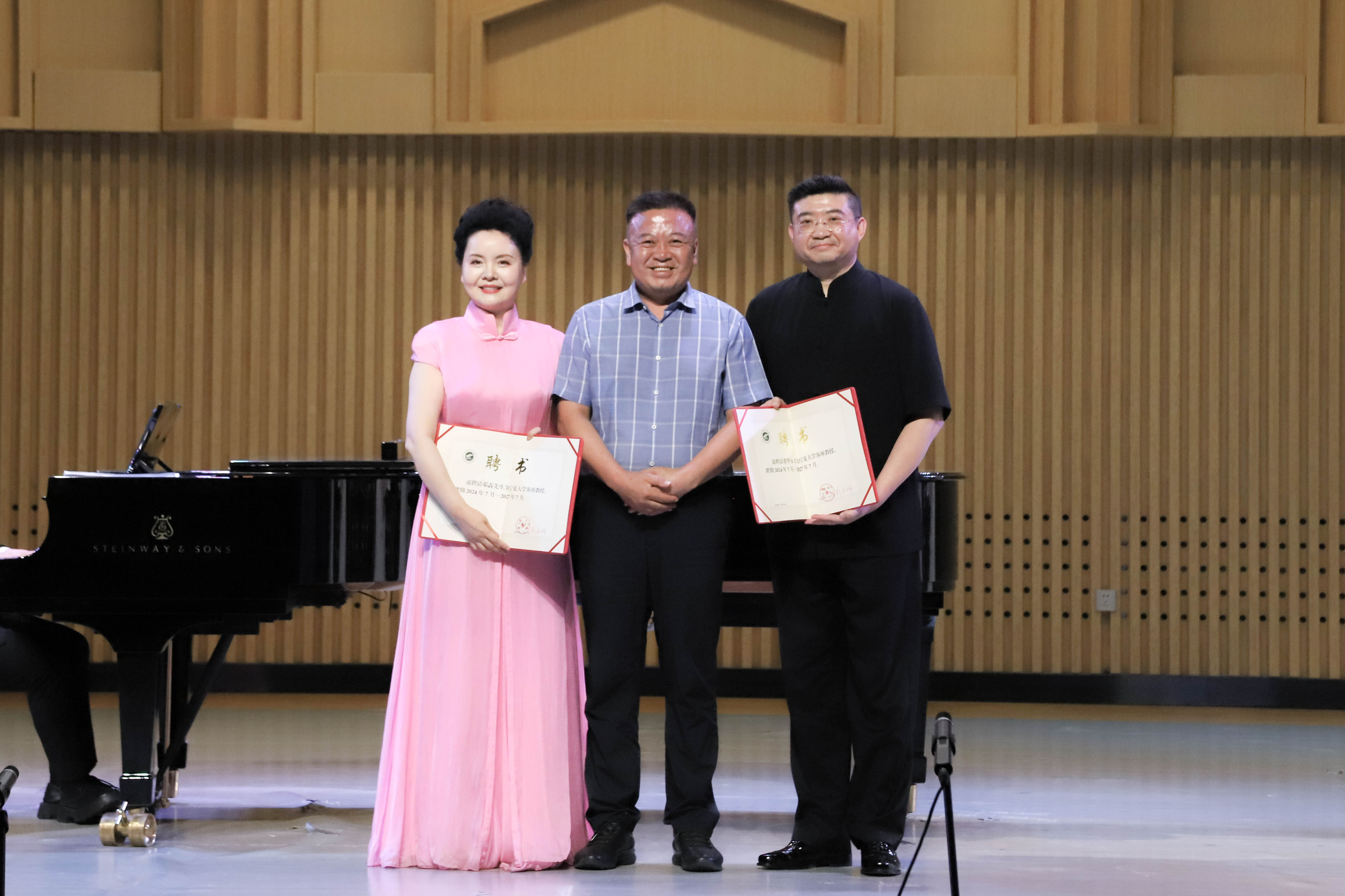 演出结束后,校党委副书记张桓为董华老师和中国音乐学院钢琴艺术指导邓垚老师颁发了客座教授聘书。