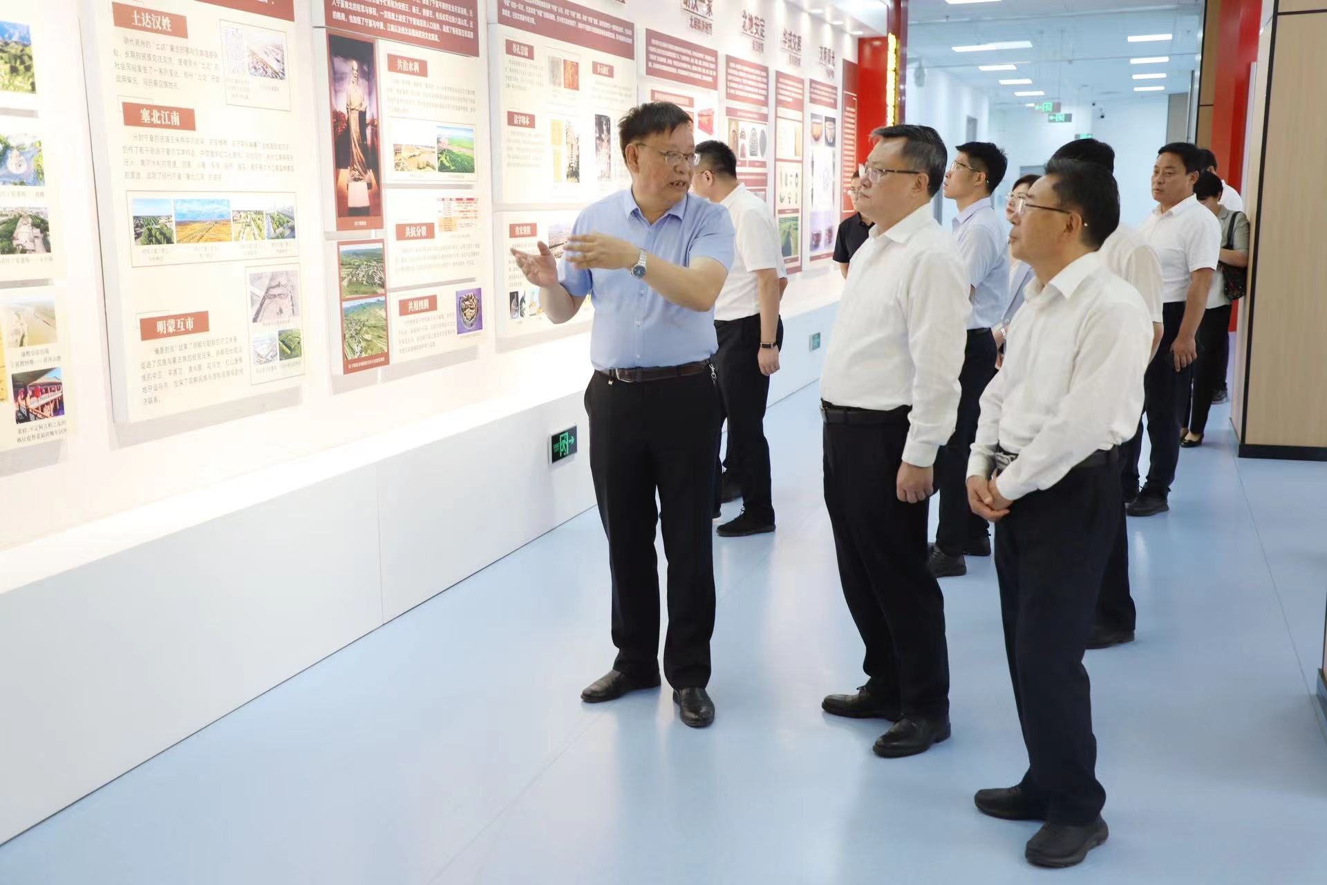 张荣一行先后来到贺兰山校区科技楼、笃行楼,调研beat365唯一官方网站西北土地退化与生态恢复国家重点实验室培育基地的总体建设情况,了解干旱土地退化机理与生态恢复、草地生态系统功能维持与高效草牧业关键技术、宁夏黄河流域文水生态与水资源利用等技术研发及生物多样性保护与生态监测管理技术集成应用情况,参观了“石榴花开塞上——铸牢中华民族共同体意识的宁夏实践”展馆。