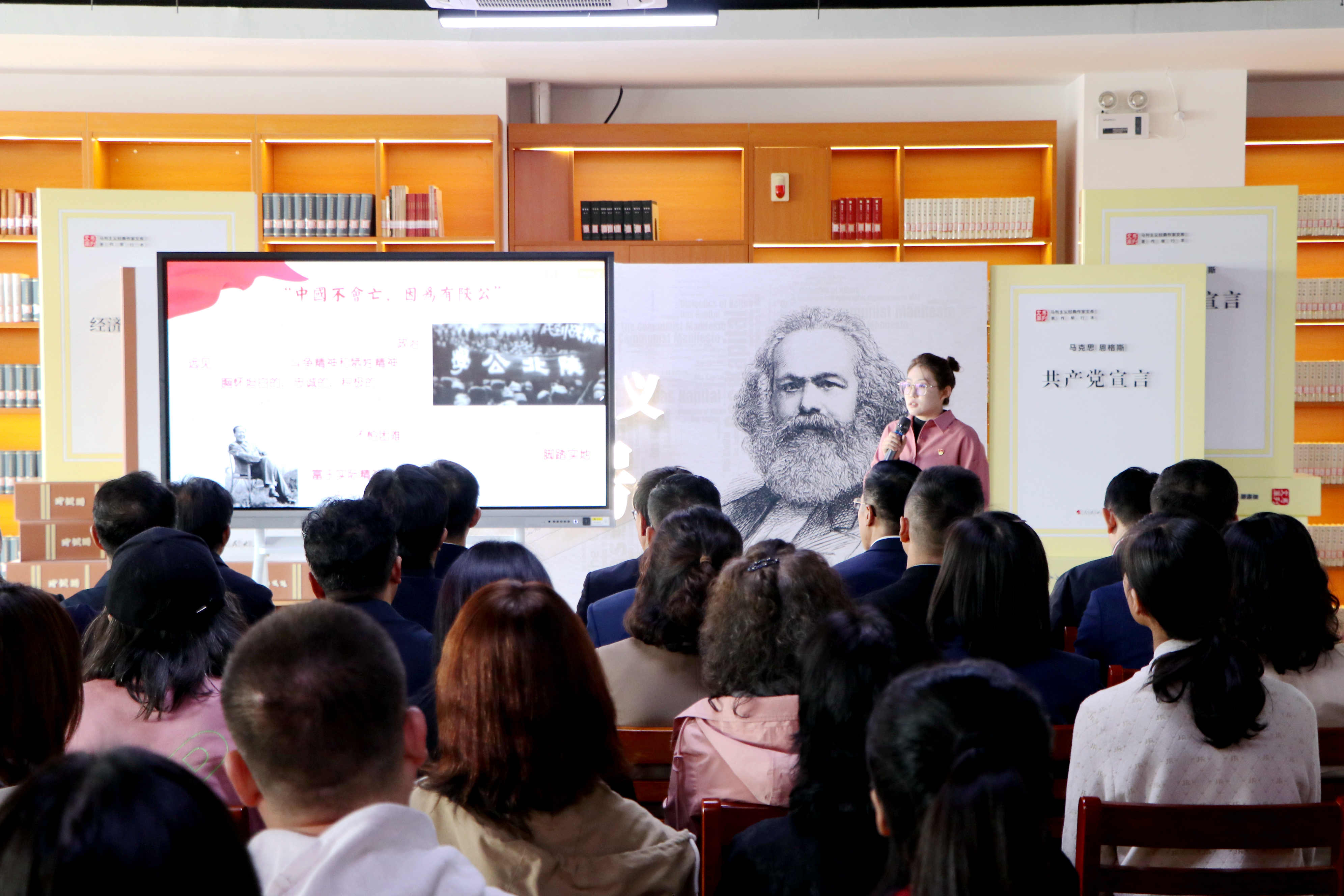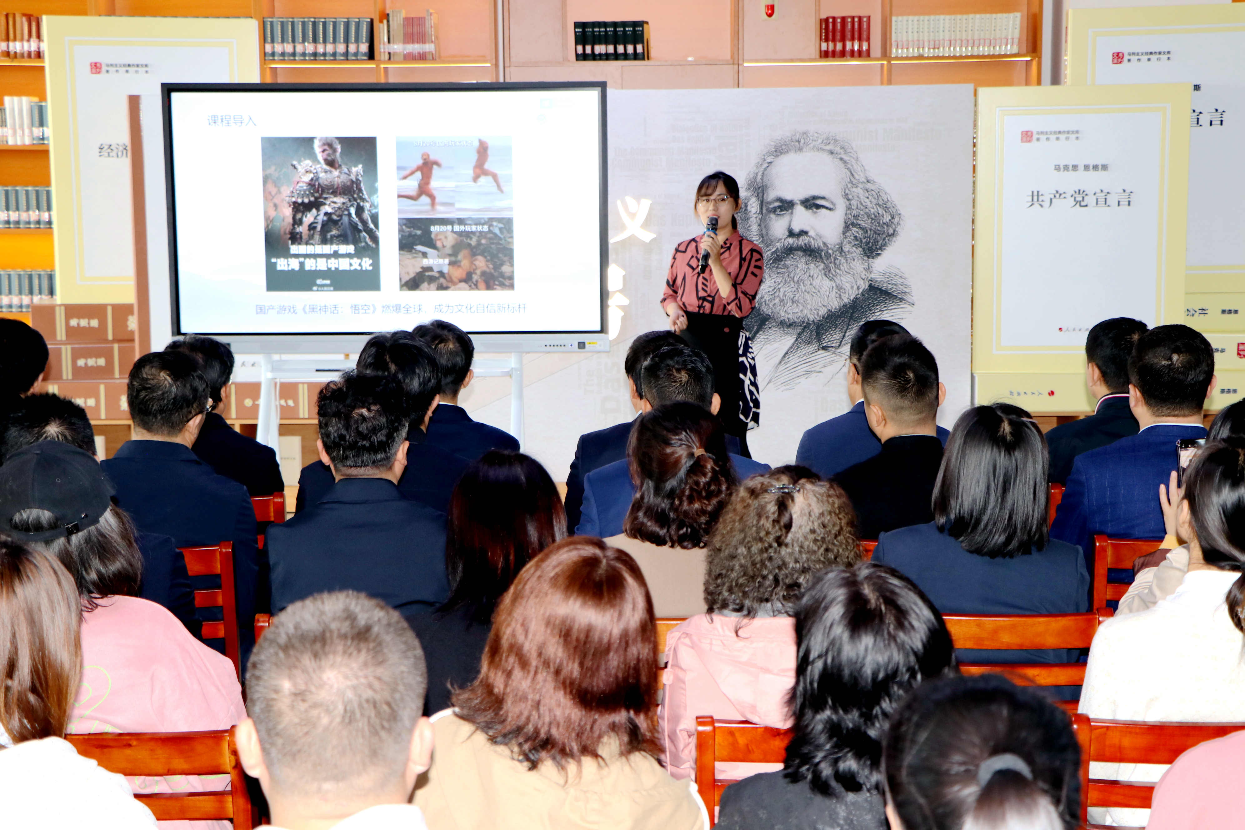 揭牌仪式后,马克思主义学院教师谢婧、研究生郝静在马克思主义书房分别讲授了《新时代为什么要强调文化自信》《争做新时代“先锋分子”》的微党课。