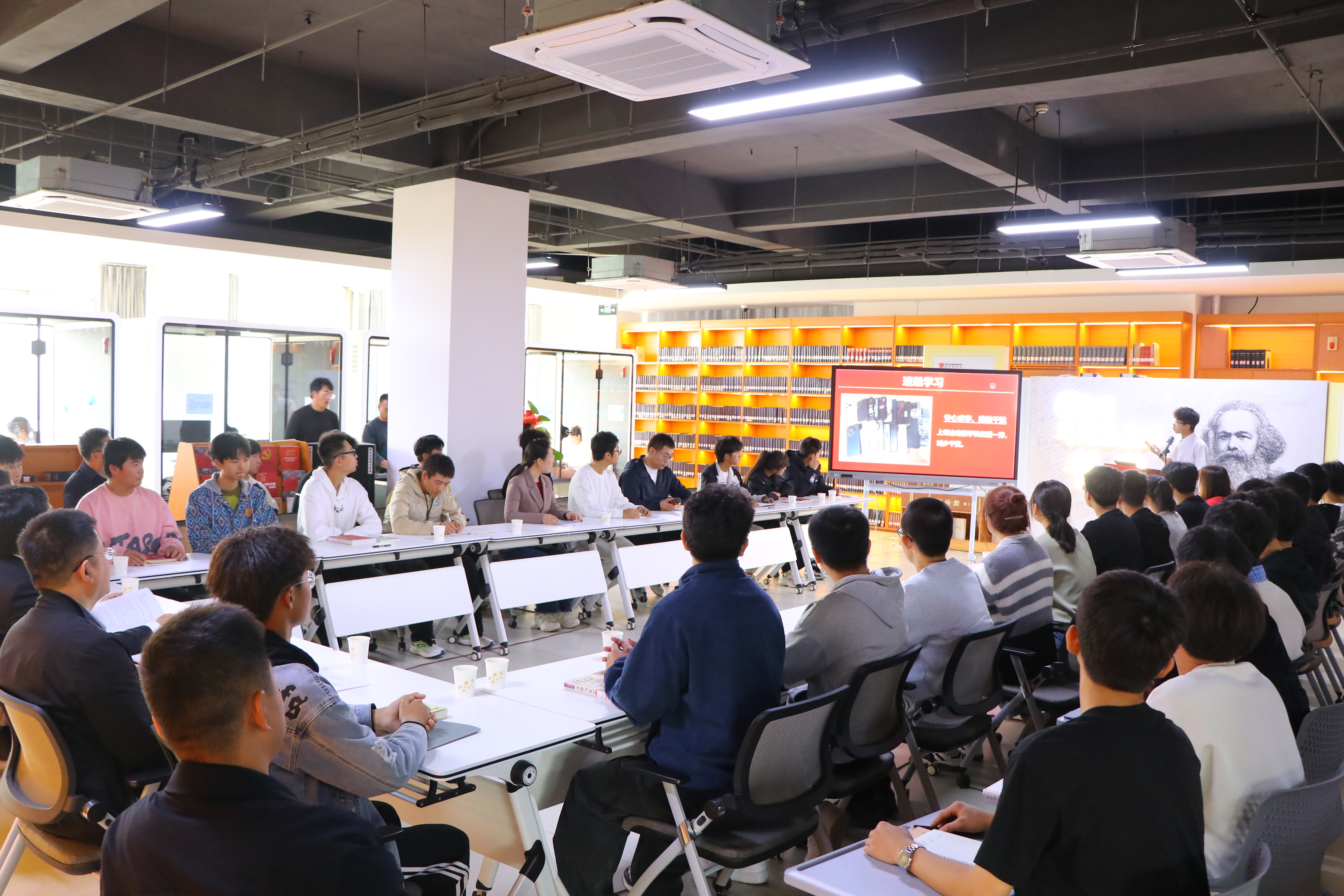 班会伊始,团支书周志平介绍了班级的基本情况、学习氛围、同学们日常生活等方面的情况。学习委员李光宇领学了马克思青年时期的勤学故事,让同学们深刻领悟了青年马克思做学问的严谨认真和应对困难从容不迫的精神品质。马汉东、杨作鑫、侯宇熙、咸富花、王力等五位同学与大家分享了各自的学习心得、入学感受及学业规划。