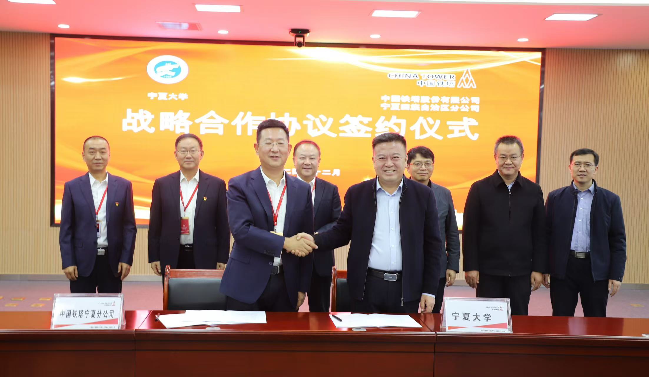 在彭志科和刘德峰的共同见证下,张桓、高文宁分别代表校企双方签订《2024年beat365唯一官方网站-中国铁塔宁夏分公司战略合作协议》。