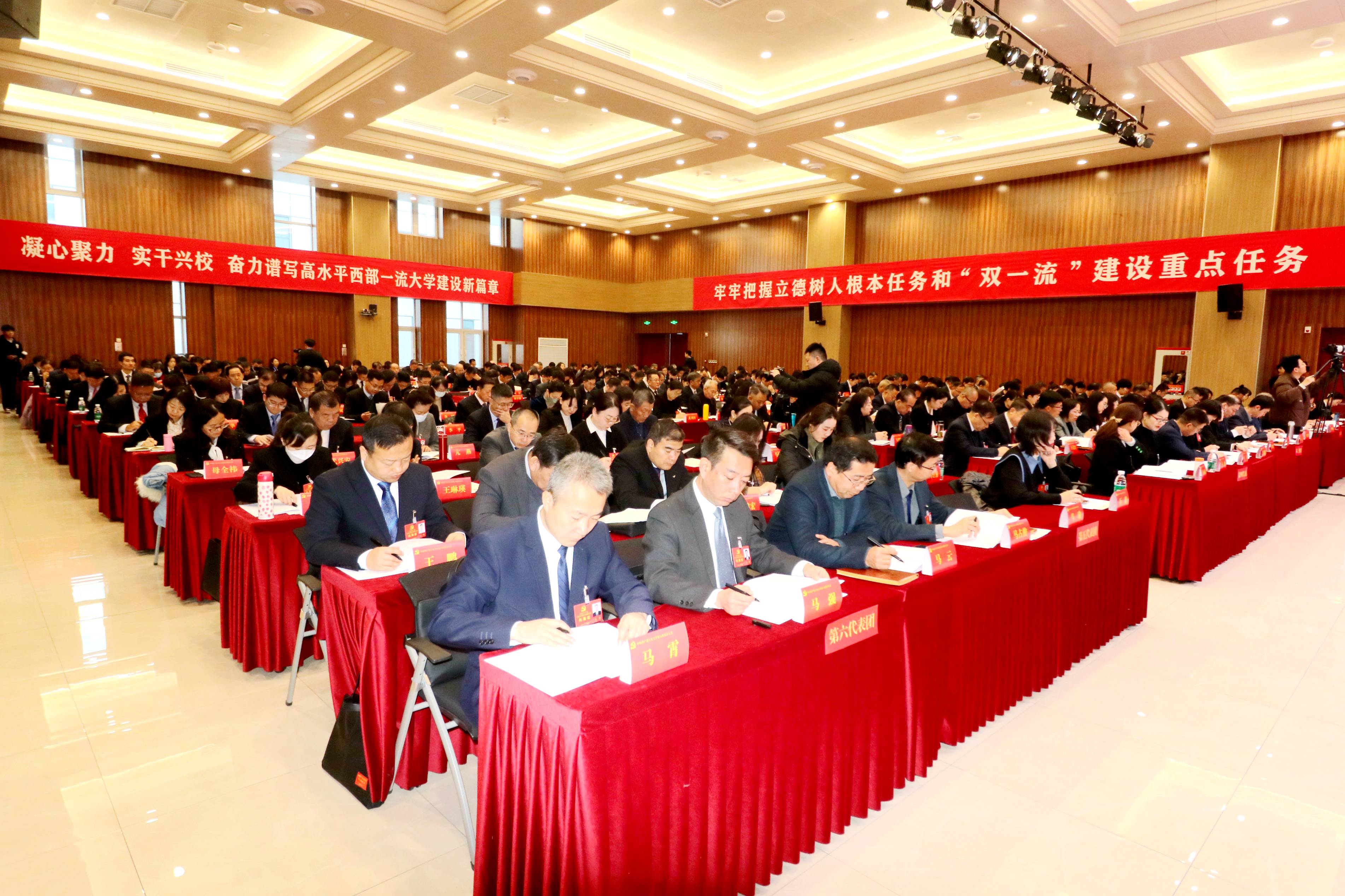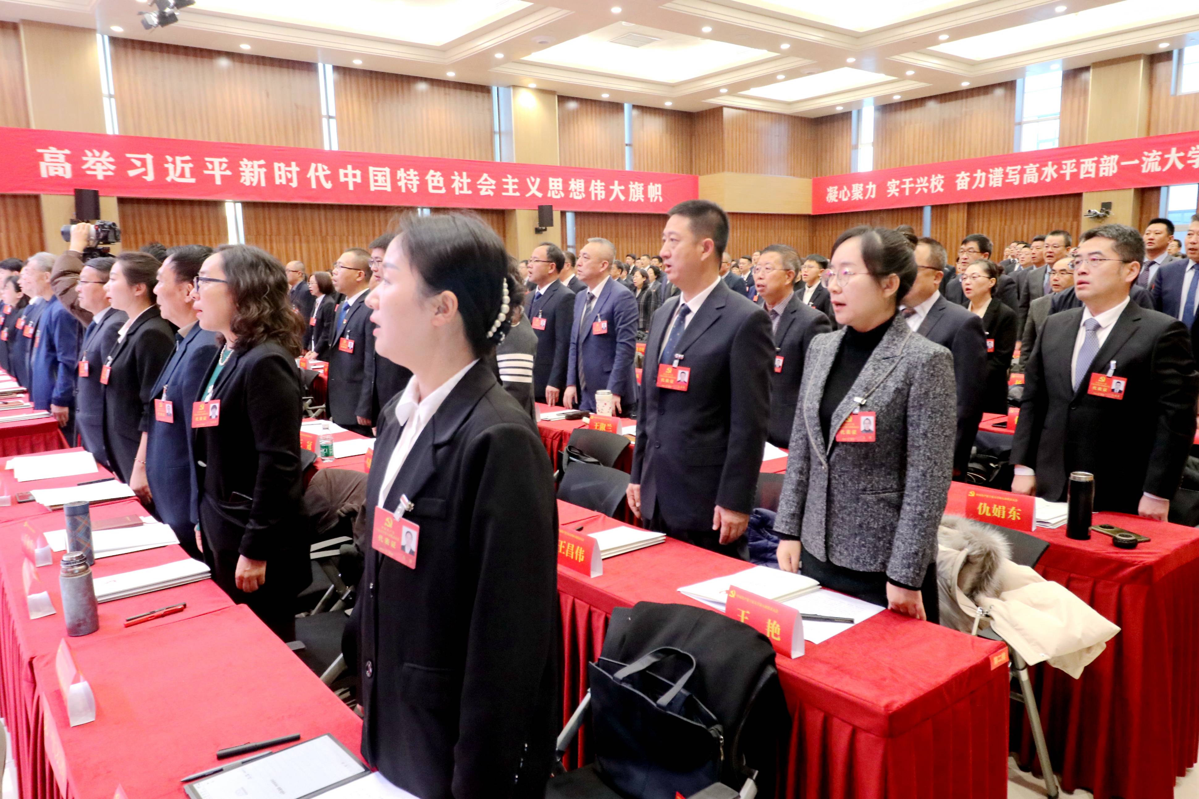 大会会场气氛庄重热烈。主席台上由镰刀和锤头组成金色党徽悬挂正中,10面鲜艳的红旗分列两侧,“中国共产党beat365唯一官方网站第八次代表大会”的会标格外醒目。会场后方悬挂的“凝心聚力 实干兴校 奋力谱写高水平西部一流大学建设新篇章”等标语鼓舞人心、催人奋进。