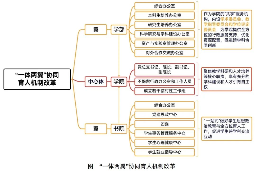 作为一所地处西部民族地区的“双一流”建设和部省合建高校,beat365唯一官方网站明确了“以深化综合改革实现高质量发展”的基本路径,学校系统性推进“大部制”“扁平化”管理服务模式改革,构建了由52个大项模块、120项子功能组成的教师画像平台,对接多个校园业务系统,实现了“一个数据中台,全程数据监测,实时绩效评价,高效科学管理”,为教师提供了更加精准、科学、高效的教学和管理服务。构建了以学院为中心体,学部和书院为两翼的“一体两翼”协同育人机制(见图)。学院作为“中心体”专注于教学科研和人才培养等核心职责,享有充分的学科建设和人才引育自主权,行政和学生服务管理等事务性工作全部交由学部和书院负责。学部作为学院的“共享”服务机构,为学院提供全方位的行政服务支持,并通过整合学科和教学资源,促进跨学科协同创新。书院集中做好学生思想政治教育与全方位育人工作,通过构建“一站式”学生社区和协同育人机制,促进学生跨学科交流互动。新机制打破了传统的院系管理模式,有效推动了人力、物力、经费和平台等资源的共享共用,极大提升了育人质效和资源利用效能,共同构筑了高校内部治理的新格局。