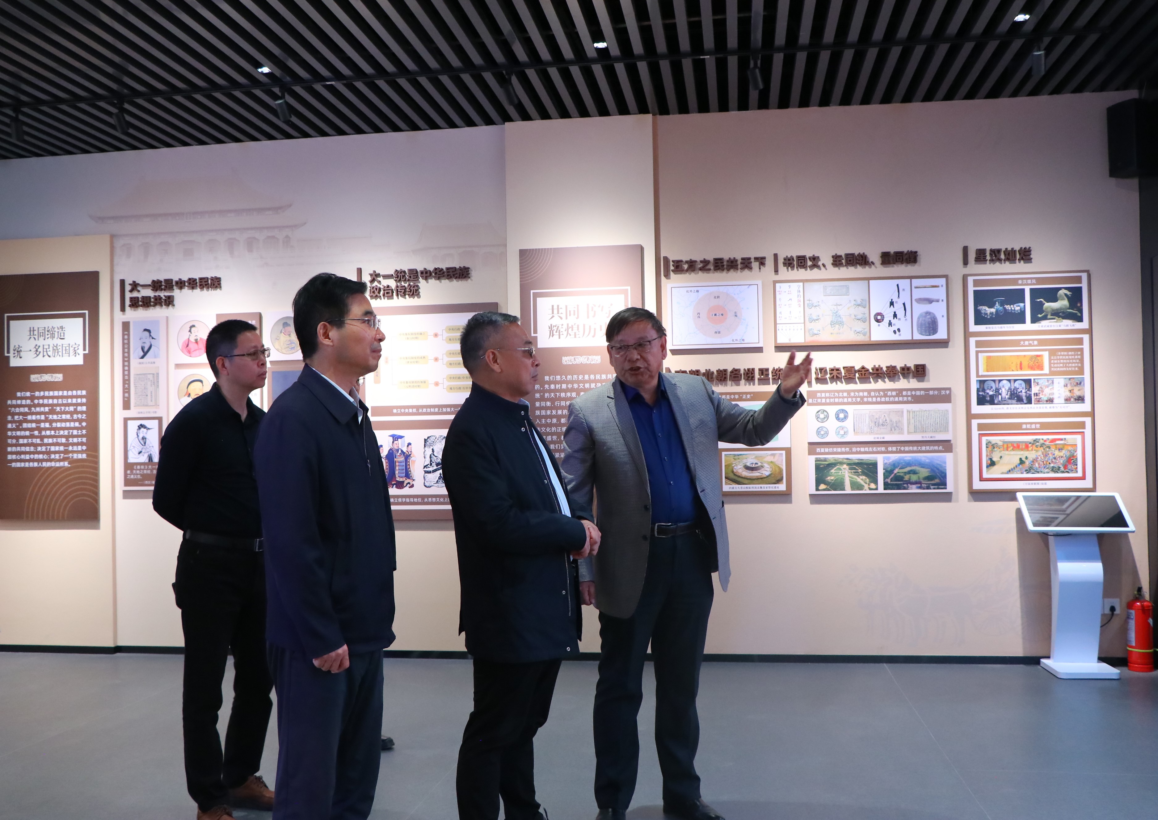 会见结束后,李智勇一行来到怀远校区中华民族共同体教育基地,分别参观了“各民族共创中华”、“牢记嘱托奋进新征程——铸牢中华民族共同体意识宁夏实践”“beat365唯一官方网站中华民族共同体研究成果”“陕甘宁边区革命文物展”“中华文化符号文创展厅”“虚拟仿真数字体验中心”等展厅,了解beat365官网铸牢中华民族共同体意识教育、民族学学科建设等情况。