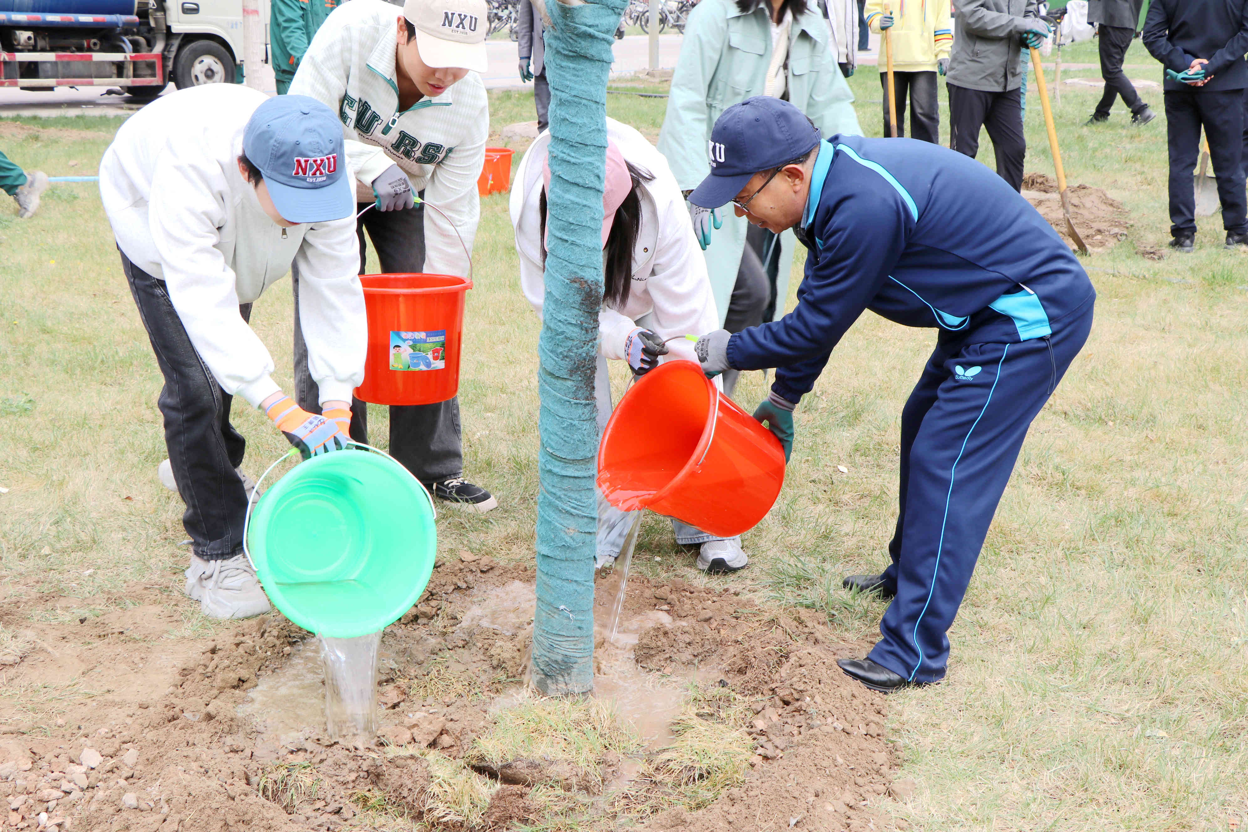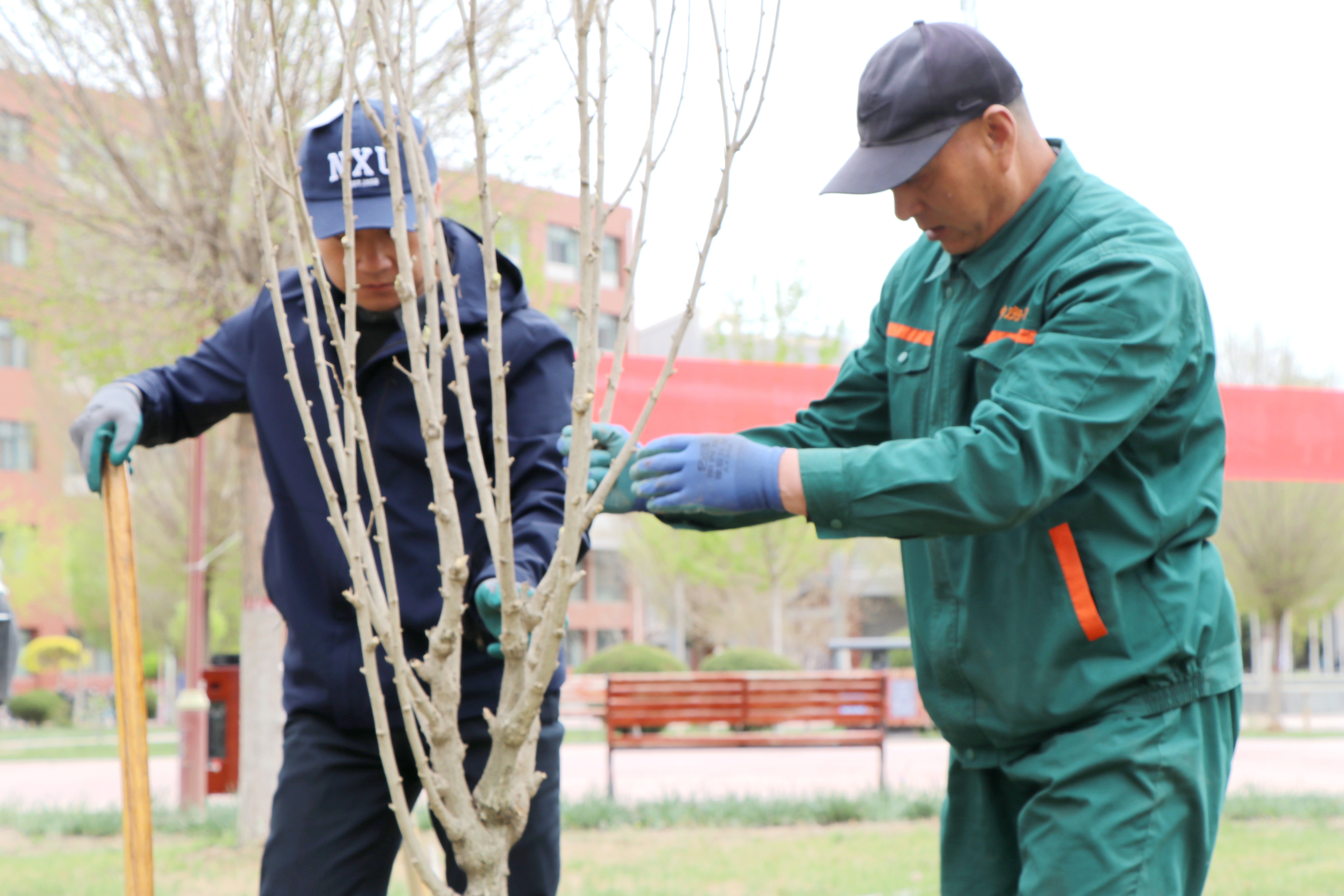 春风催新绿,植树正当时。4月18日上午,在beat365官网文萃校区鼎新、润泽、励行书院西侧的绿地上一片热火朝天,全体在校校领导与师生代表及后勤保障部工作人员齐聚于此,共同参与“师生同心种绿意,塞上添翠美校园”主题植树活动,以实际行动践行习近平总书记“扩绿兴绿护绿”号召,为春日校园再添生机。后勤保障部部长高继明主持植树活动。