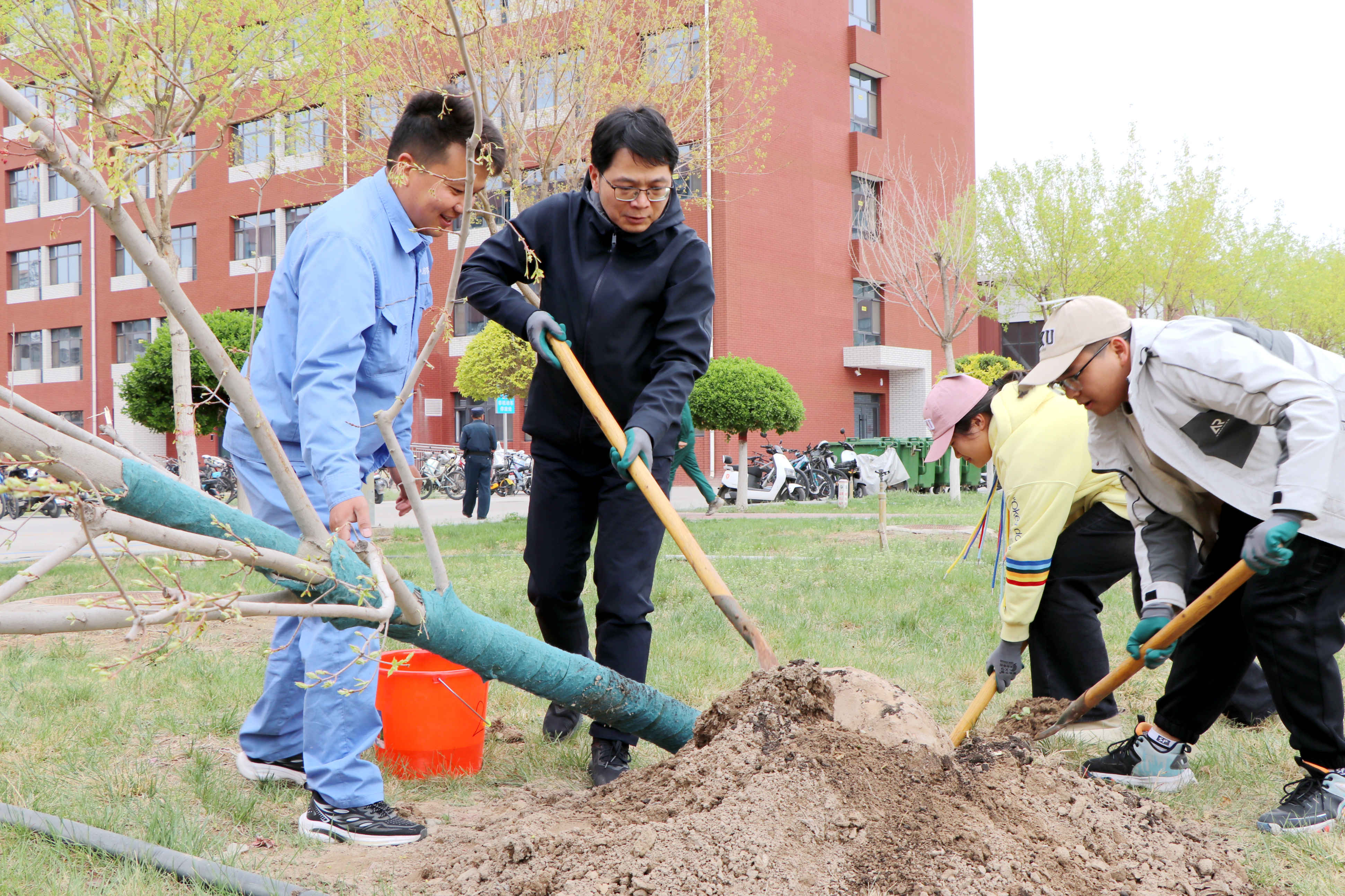 全体参与人员领取劳动工具,校领导带头示范,与师生协同配合,在后勤保障部工作人员的专业指导下,挥锹铲土、扶树正苗、培土压实、浇水灌溉。大家每一个环节都做得认真细致,在植树过程中也分享着劳动技巧和体会,师生共上劳动教育课,以实际行动为校园增绿添彩。经过近一个小时的劳动,一棵棵新苗在春日暖阳中昂然挺立,孕育出绿色的希望。