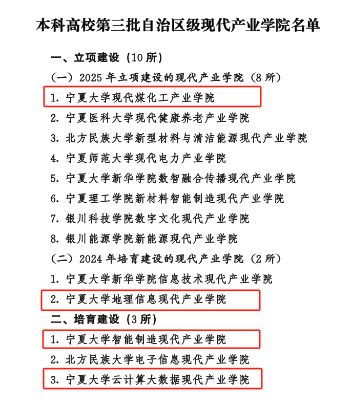 【beat365唯一官方网站新闻中心讯 本科生院】近日,自治区教育厅、发展和改革委员会、工业和信息化厅联合公布本科高校第三批自治区级现代产业学院建设名单,beat365官网四所现代产业学院成功入选。其中,地理信息、现代煤化工获批自治区级现代产业学院,智能制造、云计算大数据获批自治区重点培育现代产业学院。截至目前,beat365官网挂牌成立的9个现代产业学院,荣获自治区立项建设达到8个,占比88.9%,标志着beat365官网在深化产教融合、服务自治区经济发展和产业升级方面实现新突破。