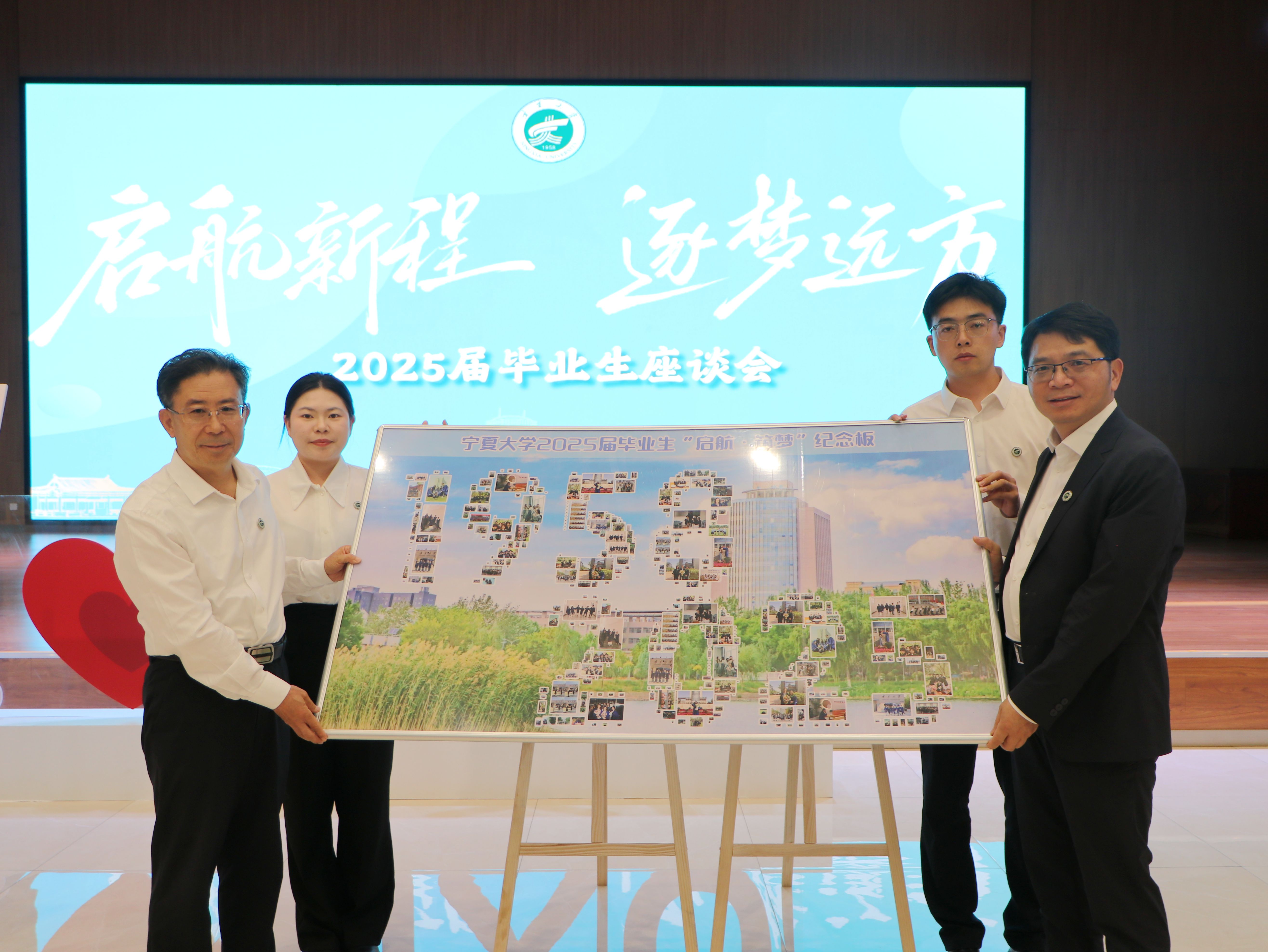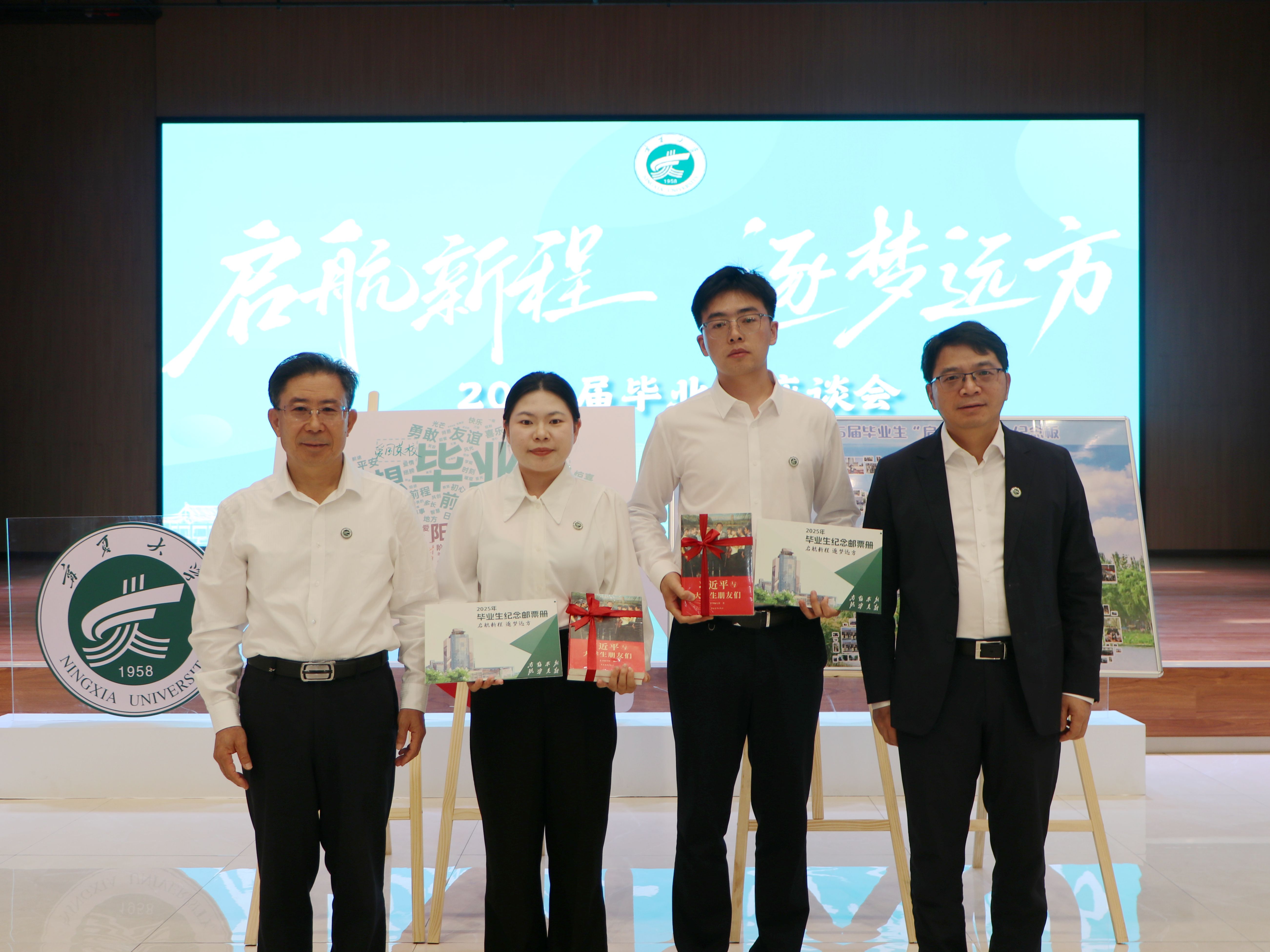 会上,毕业生代表向学校赠送了精心准备的特别礼物:“启航・筑梦”纪念册和“桃李芬芳”沙枣树。纪念册用2025届毕业生的毕业照拼成学校建校时间“1958”与毕业年份“2025”,让光影定格跨越六十七载的校史传承;“桃李芬芳”沙枣树由毕业生祝福语关键词拼就,“梦想”“时光”“青春”等词语如枝叶舒展,见证了同学们在学校的每一次成长。校党委书记李星,校党委副书记、校长彭志科也向毕业生代表赠送了精选书籍《习近平与大学生朋友们》第一卷、第二卷和学校专门定制的《常回家看看》纪念邮票册。